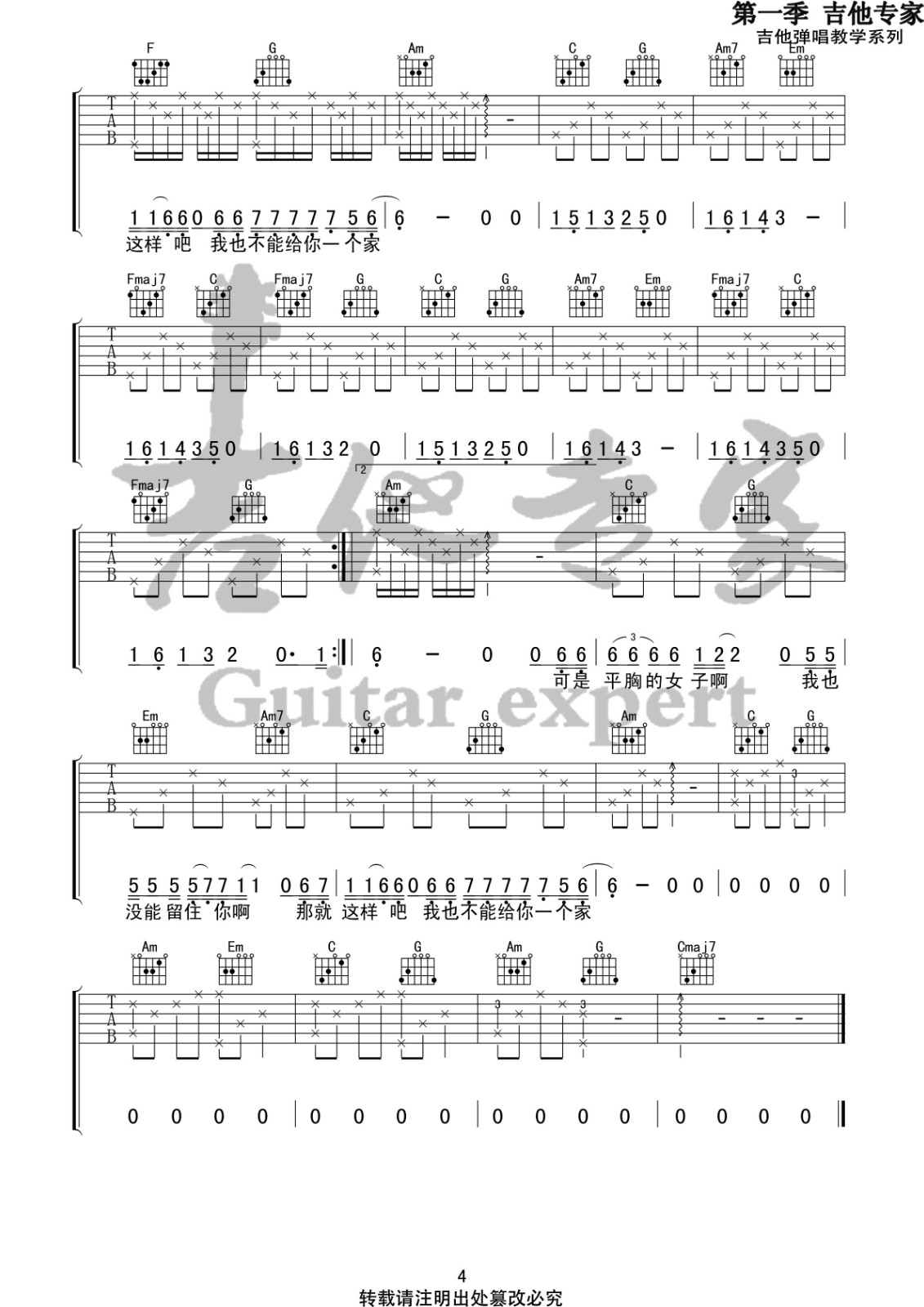 曲谱介绍: 枯木逢春《平胸女子》吉他弹唱谱,采用C调指法编配,音艺吉他编配出品,共有4张高清图谱。