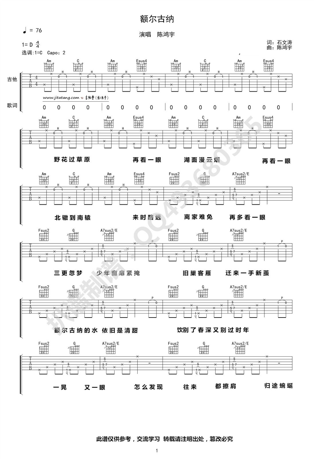 曲谱介绍: 陈鸿宇《额尔古纳》吉他弹唱谱,采用D调指法编配,共有3张高清图谱。