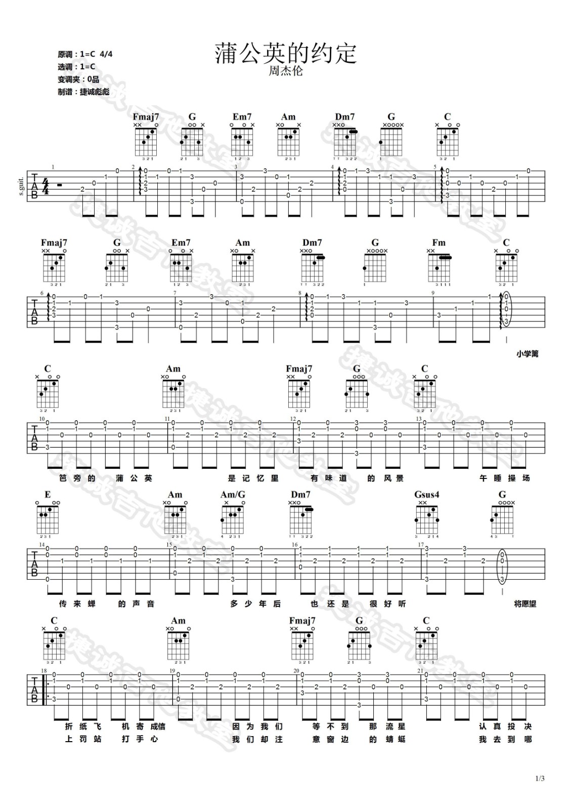 曲谱介绍: 周杰伦《蒲公英的约定》吉他弹唱谱,采用C调指法编配,鹤唳吉他教室编配出品,共有3张高清图谱。