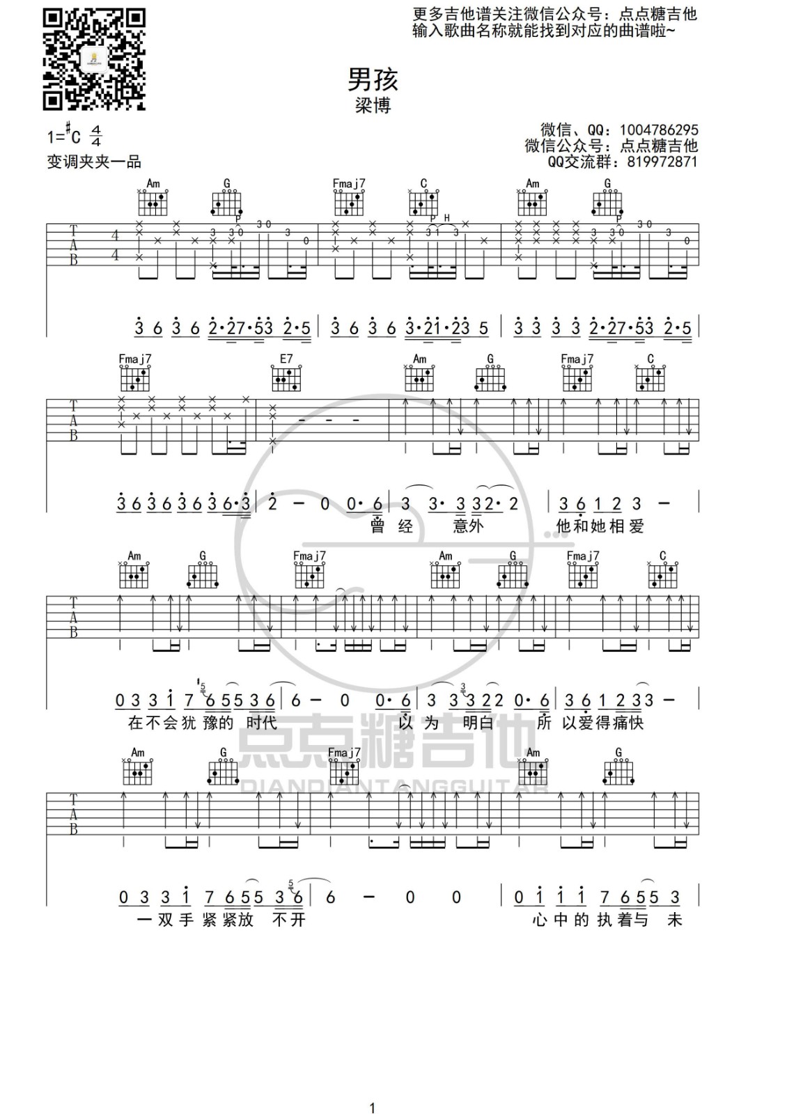 曲谱介绍: 梁博《男孩》吉他弹唱谱,采用C调指法编配,点点糖吉他编配出品,共有5张高清图谱。
