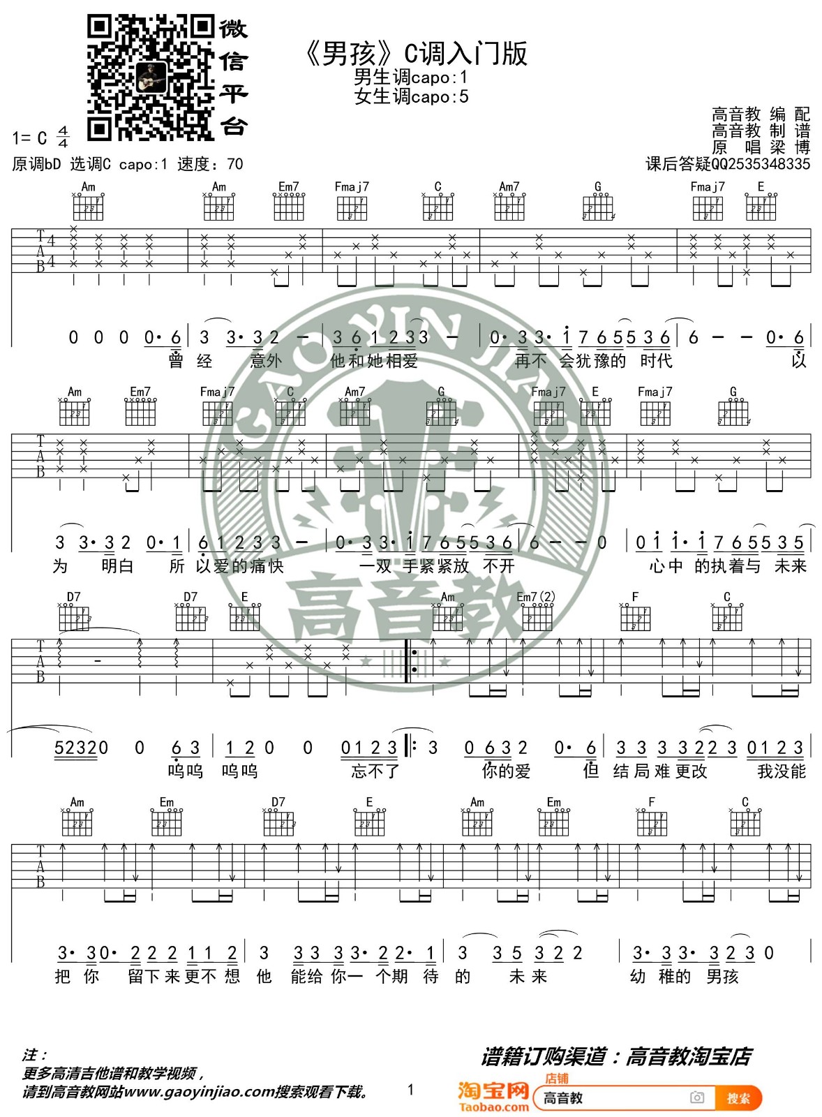 曲谱介绍: 梁博《男孩》吉他弹唱谱,采用C调指法编配,高音教编配出品,共有3张高清图谱。
