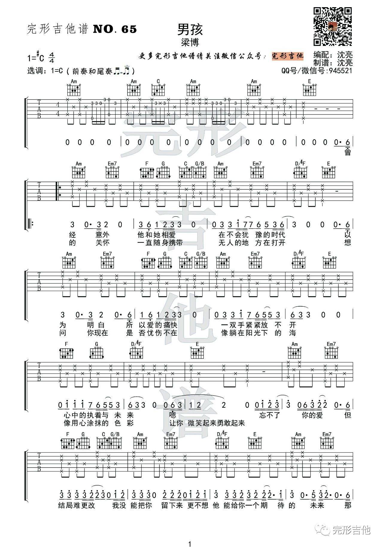 曲谱介绍: 梁博《男孩》吉他弹唱谱,采用C调指法编配,完形吉他编配出品,共有2张高清图谱,免翻页排版设计。