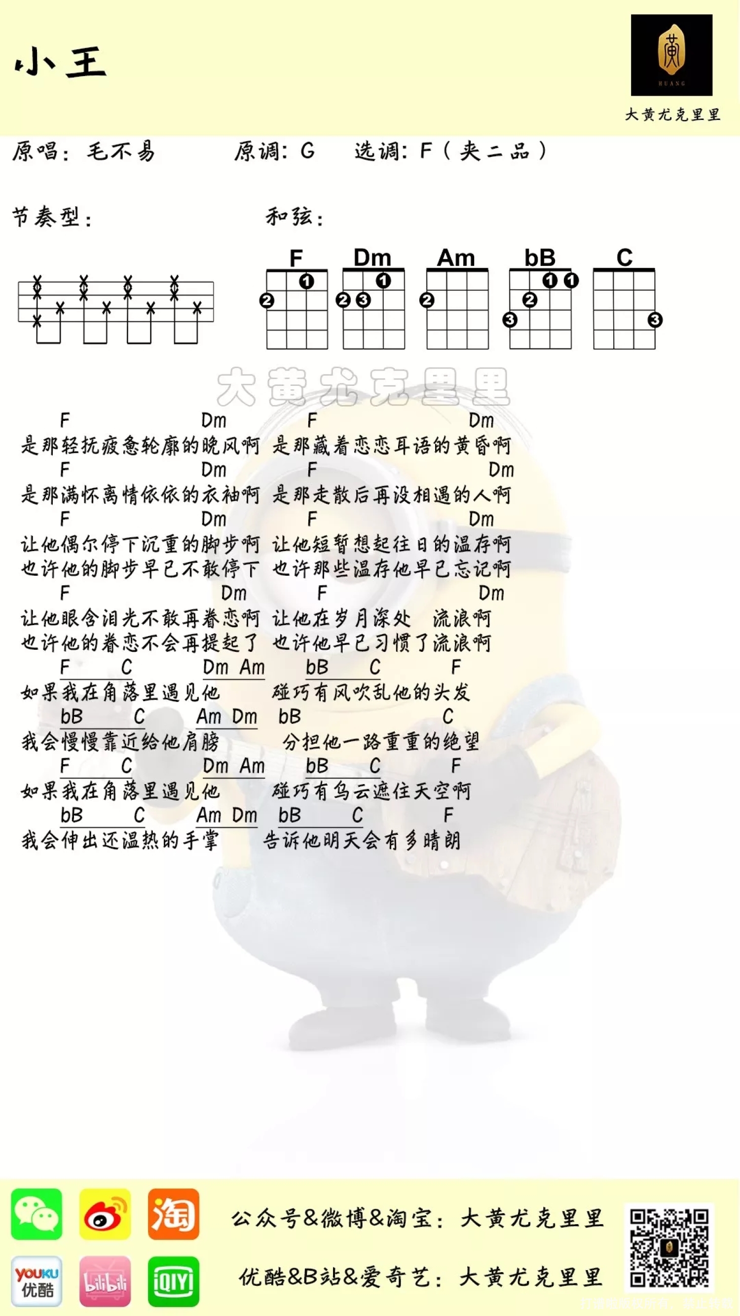 曲谱介绍: 毛不易《小王》尤克里里谱,共有1张高清图谱,免翻页排版设计。