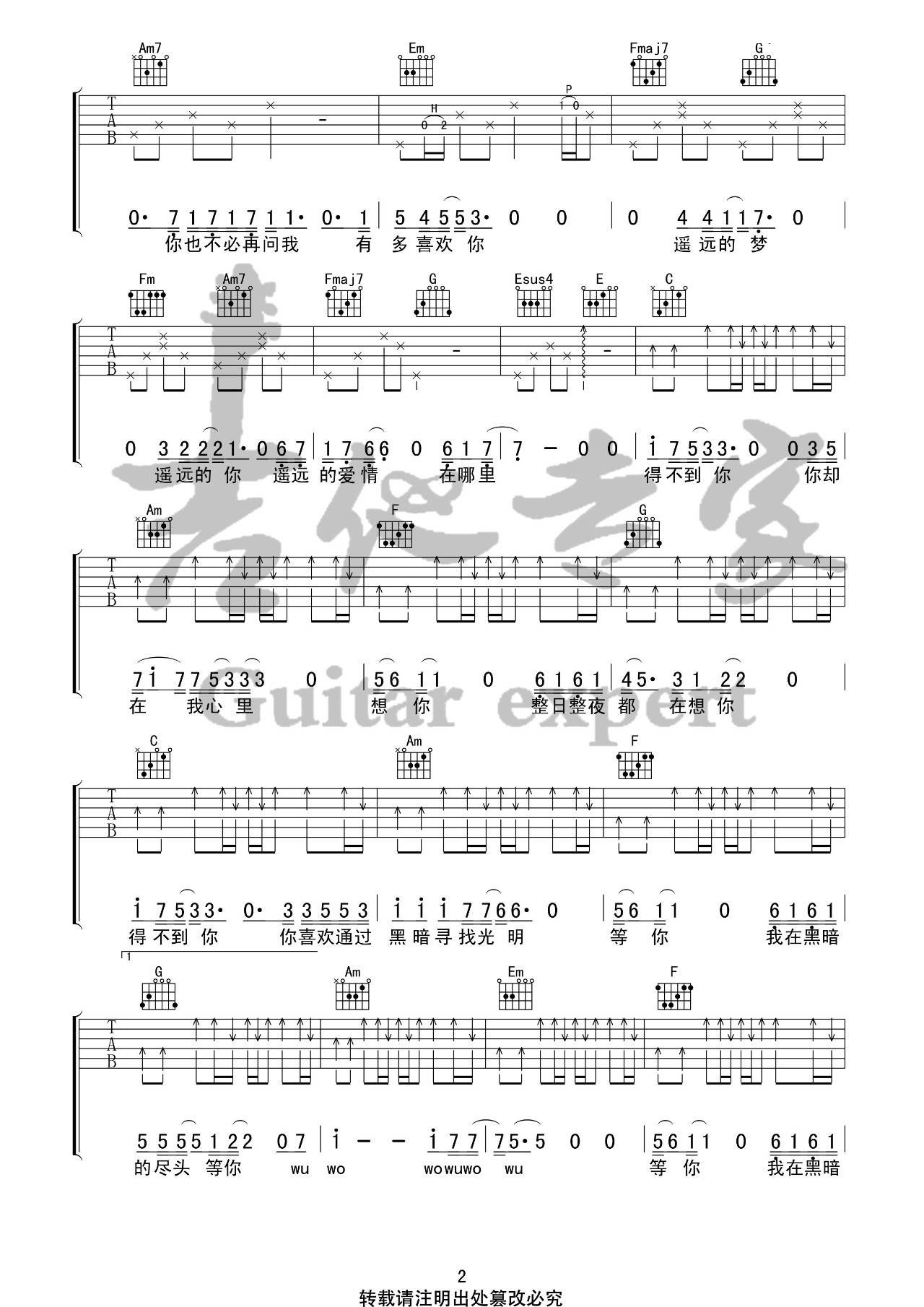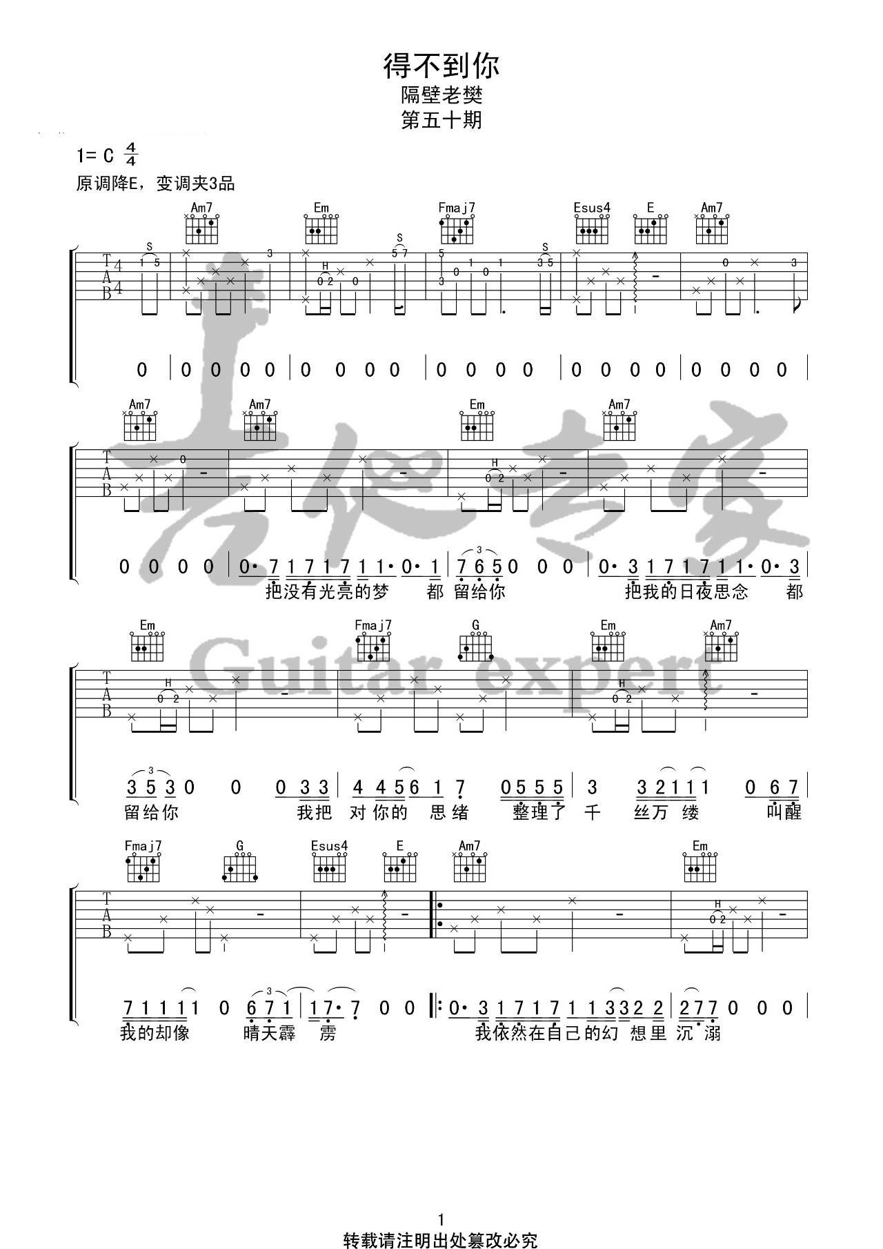 曲谱介绍: 隔壁老樊《得不到你》吉他弹唱谱,采用C调指法编配,音艺吉他编配出品,共有3张高清图谱。