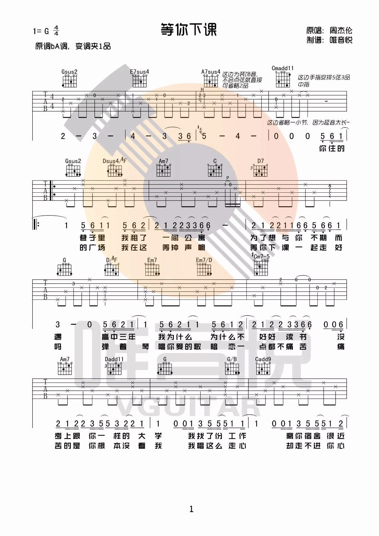 曲谱介绍: 周杰伦《等你下课》吉他弹唱谱,采用G调指法编配,共有3张高清图谱。