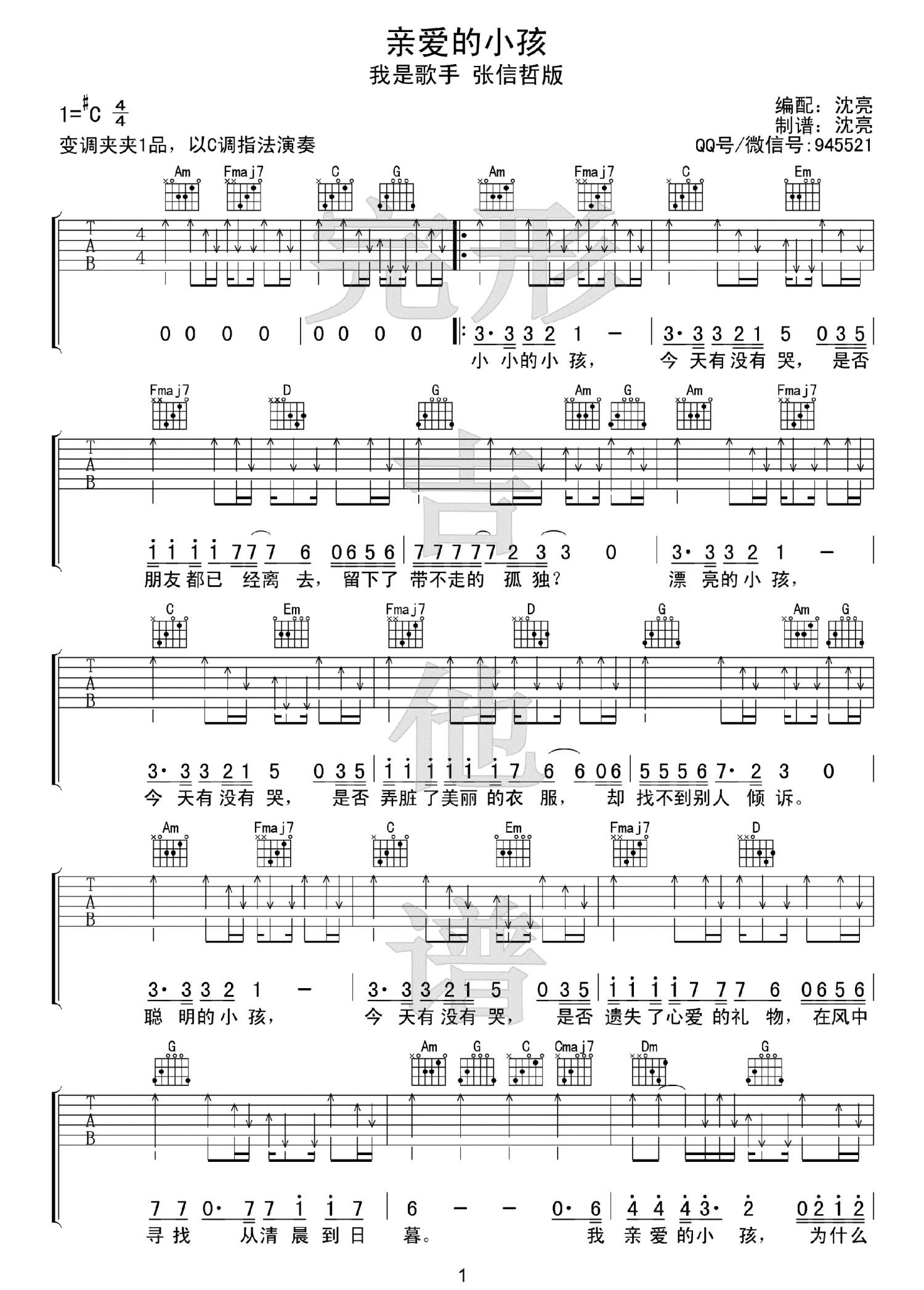 曲谱介绍: 亲爱的小孩吉他谱,张信哲演唱,一首经典老歌,电影《搭错车》插曲,原唱苏芮。亲爱的小孩六线谱,原调#C,变调夹夹一品,以C调指法演奏。本曲谱是根据我是歌手节目现场版和声伴奏改编,整首歌曲为扫弦节奏为主,琴友们需要掌握歌曲的扫弦的节奏律动。