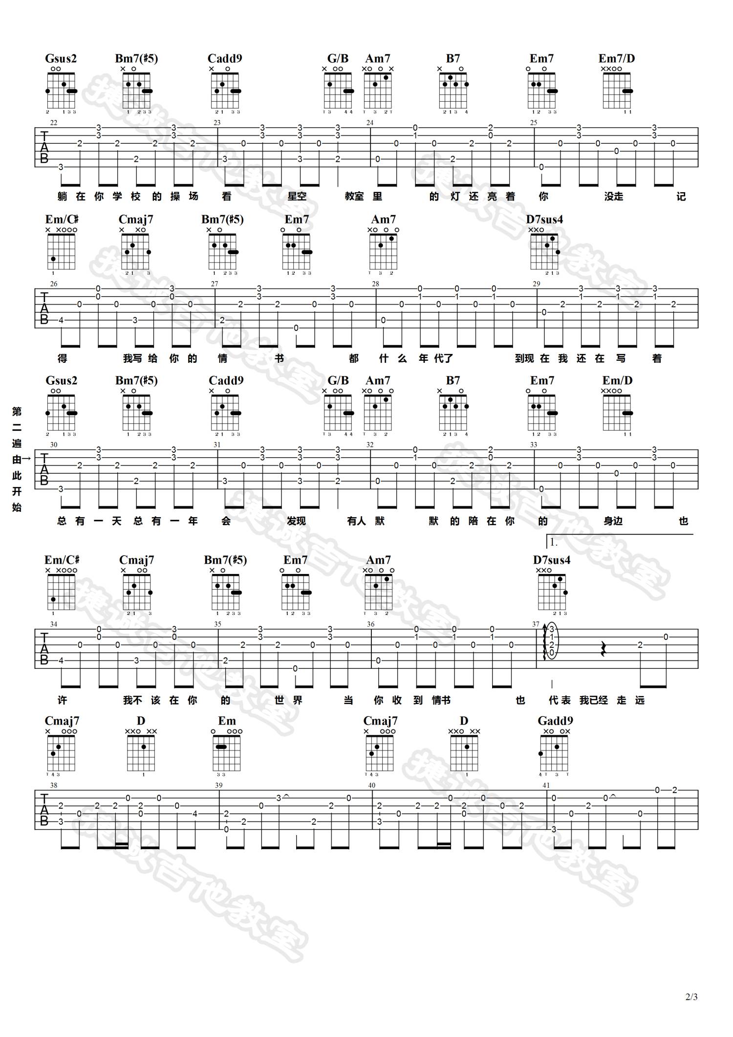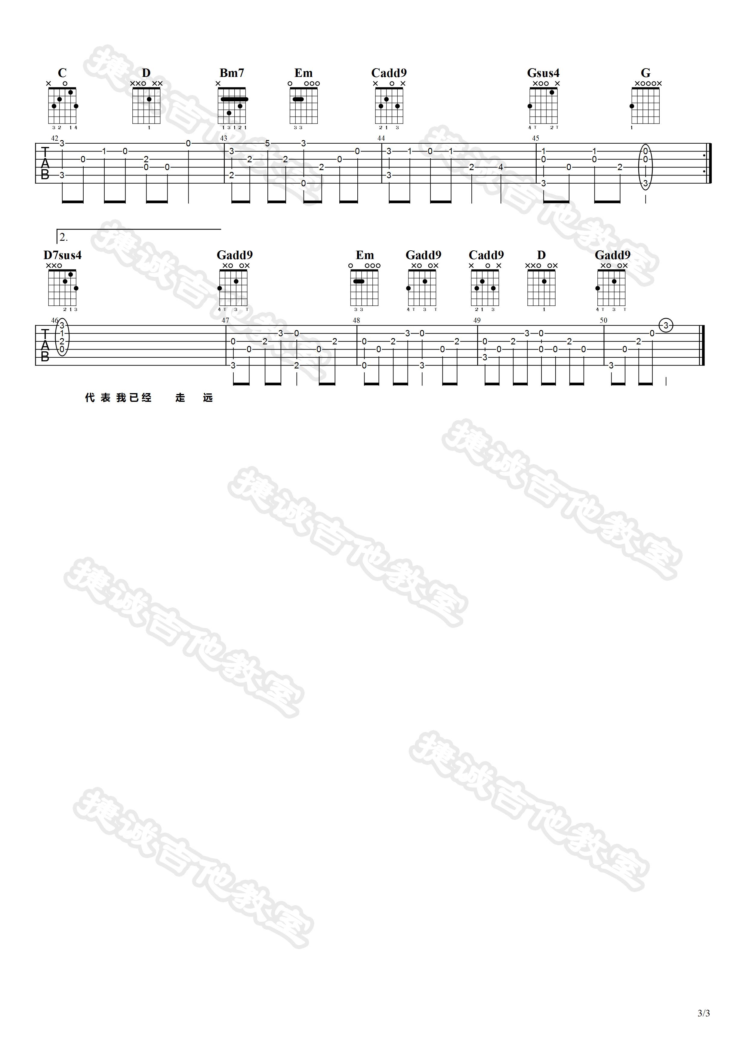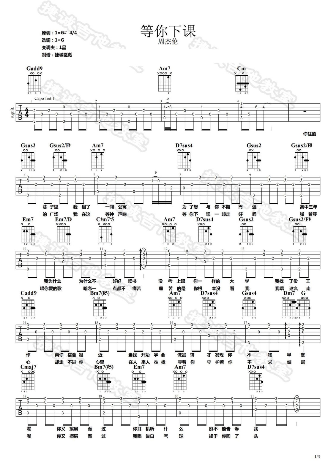 曲谱介绍: 周杰伦《等你下课》吉他弹唱谱,采用G调指法编配,捷诚吉他教室编配出品,共有3张高清图谱。