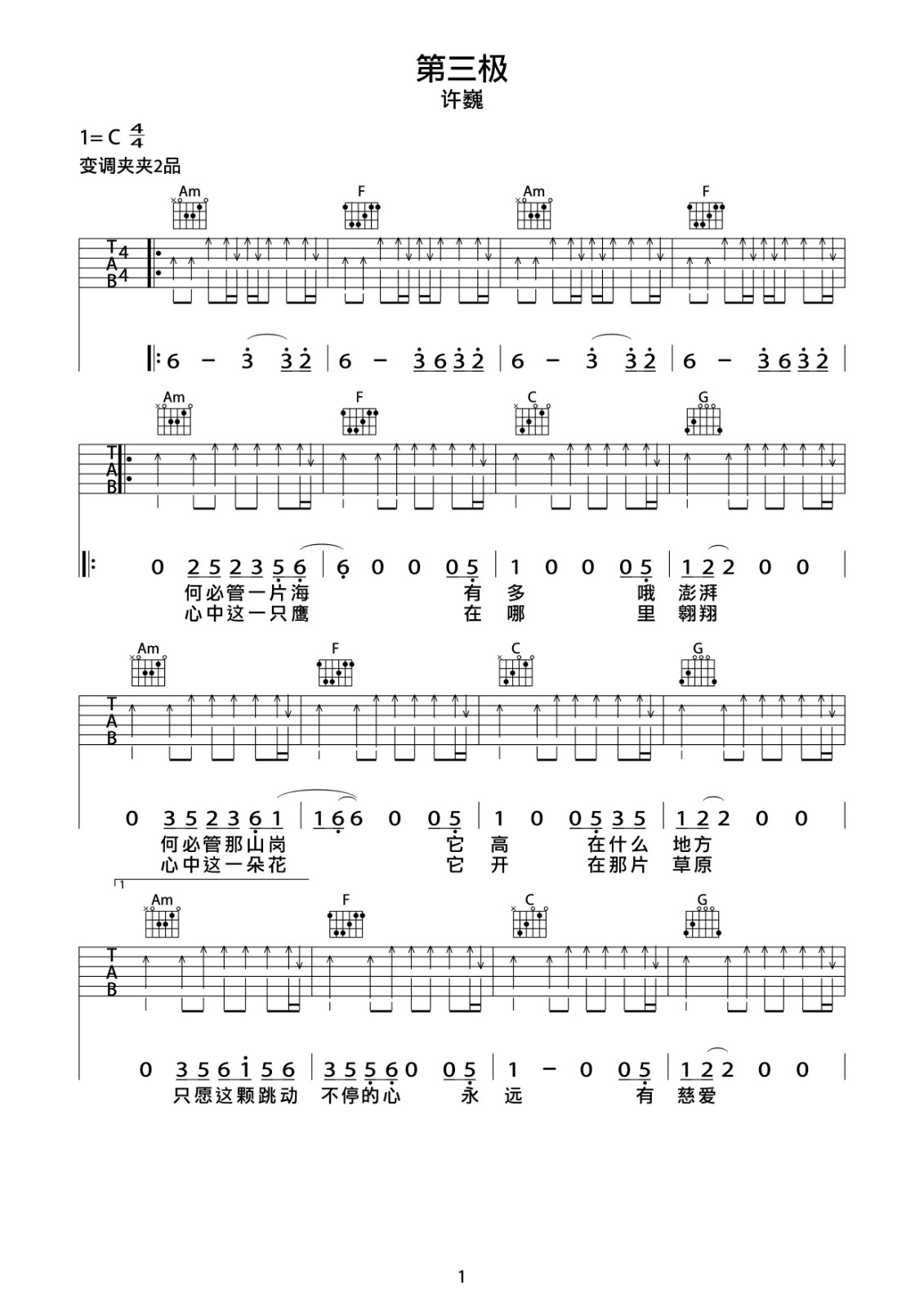 曲谱介绍: 许巍《第三极》吉他弹唱谱,采用C调指法编配,巍小琪编配出品,共有2张高清图谱,免翻页排版设计。