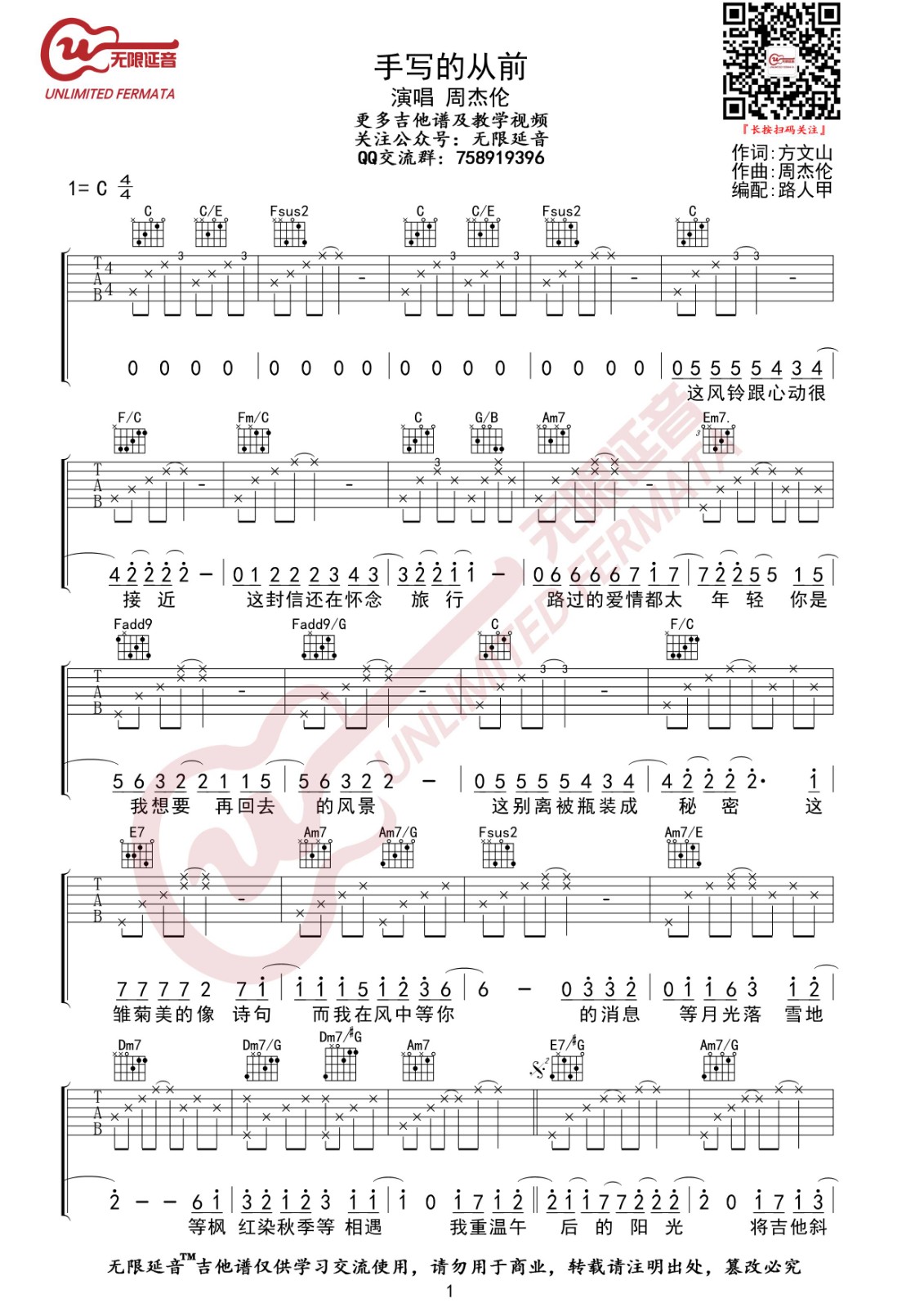 曲谱介绍: 周杰伦《手写的从前》吉他弹唱谱,采用C调指法编配,无限延音编配出品,共有4张高清图谱。