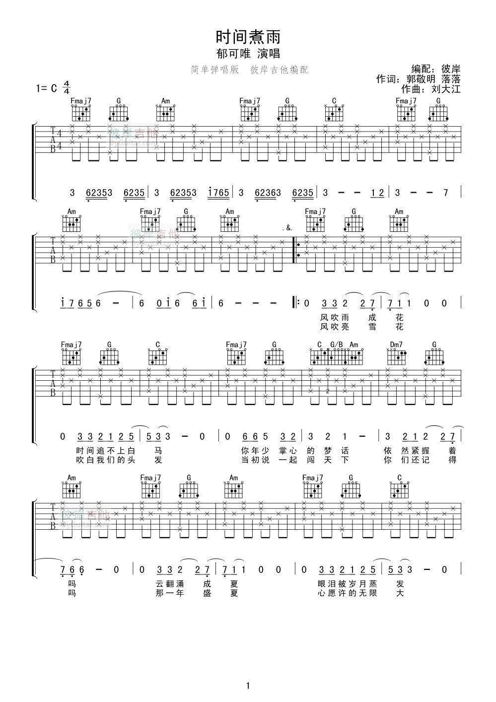 曲谱介绍: 郁可唯《时间煮雨》吉他弹唱谱,采用C调指法编配,彼岸吉他编配出品,共有3张高清图谱。