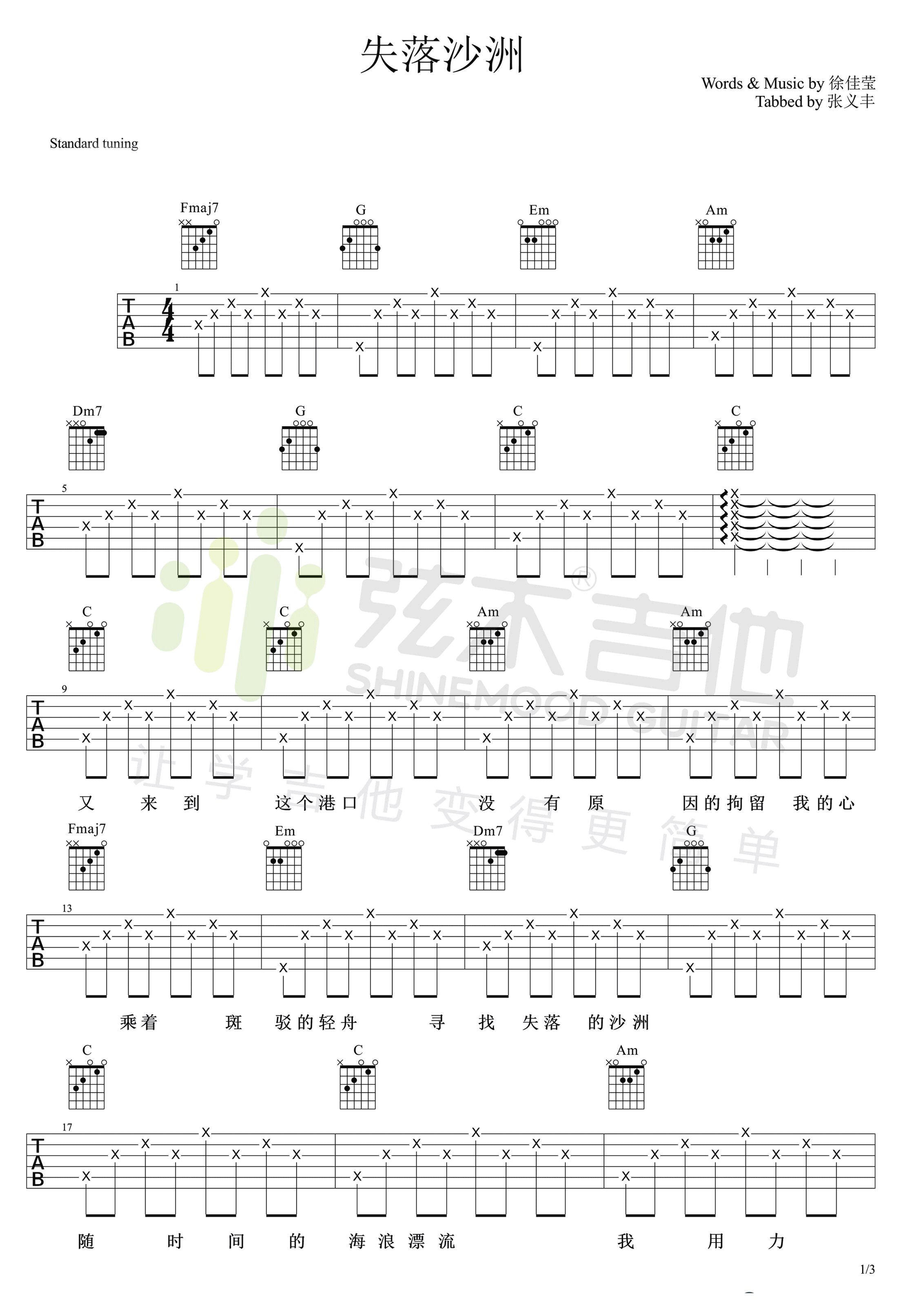 曲谱介绍: 徐佳莹《失落沙洲》吉他弹唱谱,采用C调指法编配,弦木吉他编配出品,共有3张高清图谱。