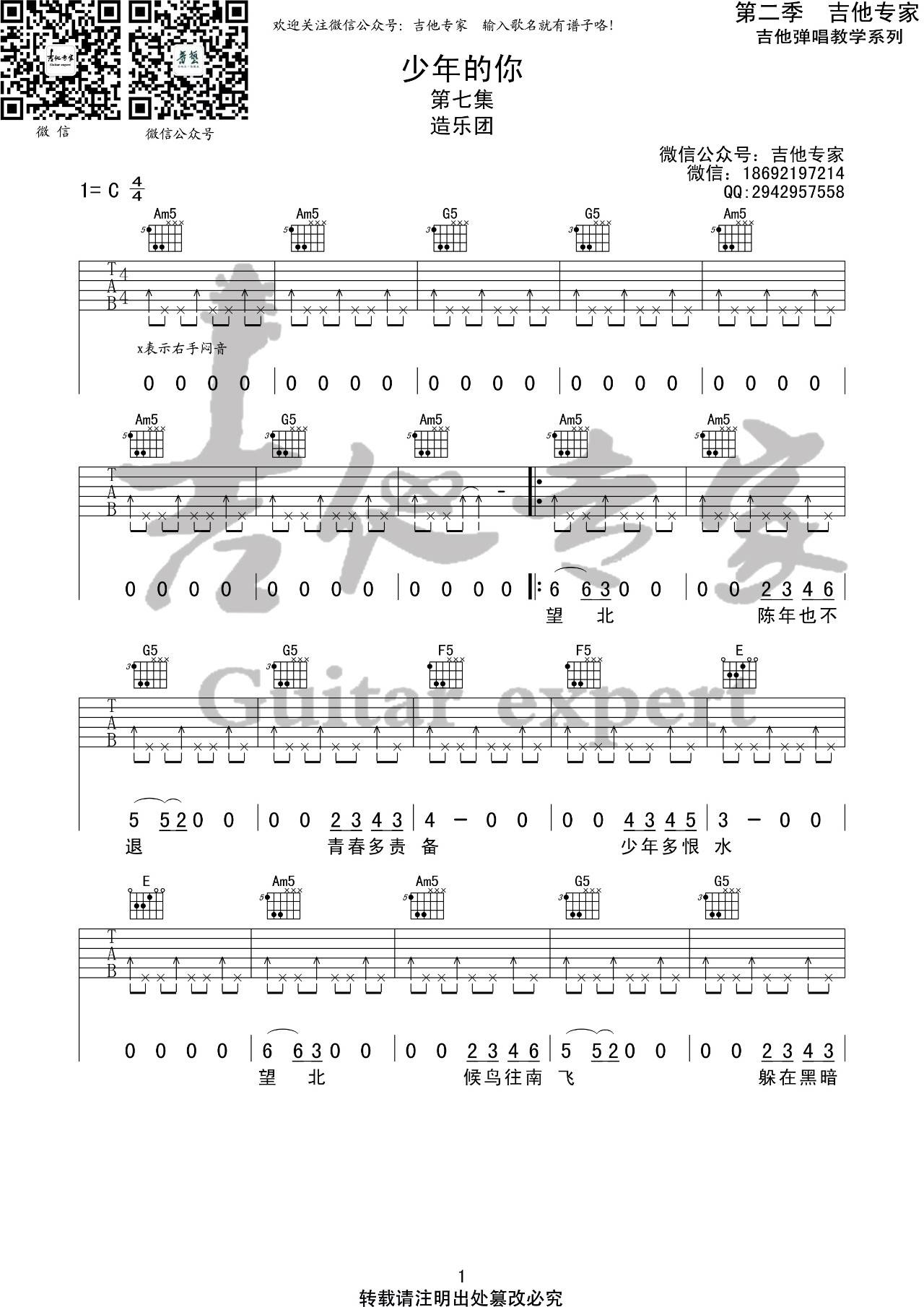 曲谱介绍: 造乐团《少年的你》吉他弹唱谱,采用C调指法编配,吉他专家编配出品,共有3张高清图谱。