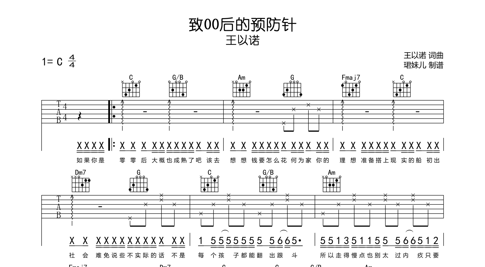曲谱介绍: 王以诺《致00后的预防针》吉他谱,由@珺妹儿制谱,《致00后的预防针》吉他弹唱谱,共三张图片谱例,本谱采用C调指法编配,速度90BPM,节奏4/4拍,可根据自己嗓音条件调整变调夹,难度较简单,易上手。
