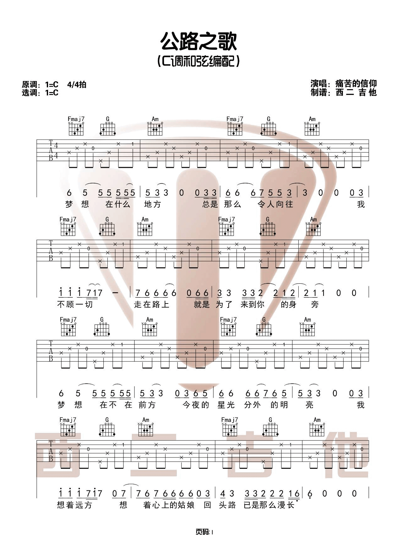 曲谱介绍: 此版本的曲谱来源于西二吉他扒谱制谱,这里采用歌曲的原调C调进行编配,演唱时根据自己的嗓音情况夹变调夹。这首歌的节奏部分比较好听,但谱中没有编配出来,整体难度主要在于几个横按和熟练运用。 《公路之歌》吉他谱_痛仰乐队_C调简单版弹唱谱_高清六线谱: