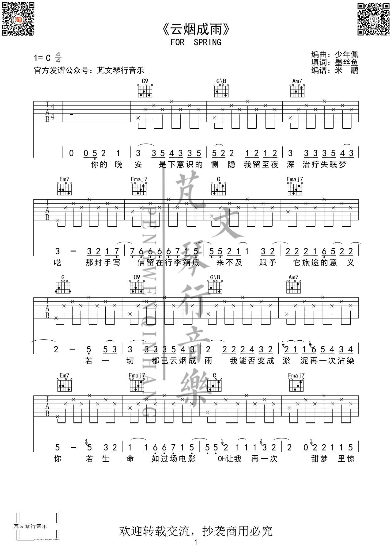 曲谱介绍: 房东的猫《云烟成雨》吉他弹唱谱,采用C调指法编配,芃文琴行音乐编配出品,共有2张高清图谱,免翻页排版设计。