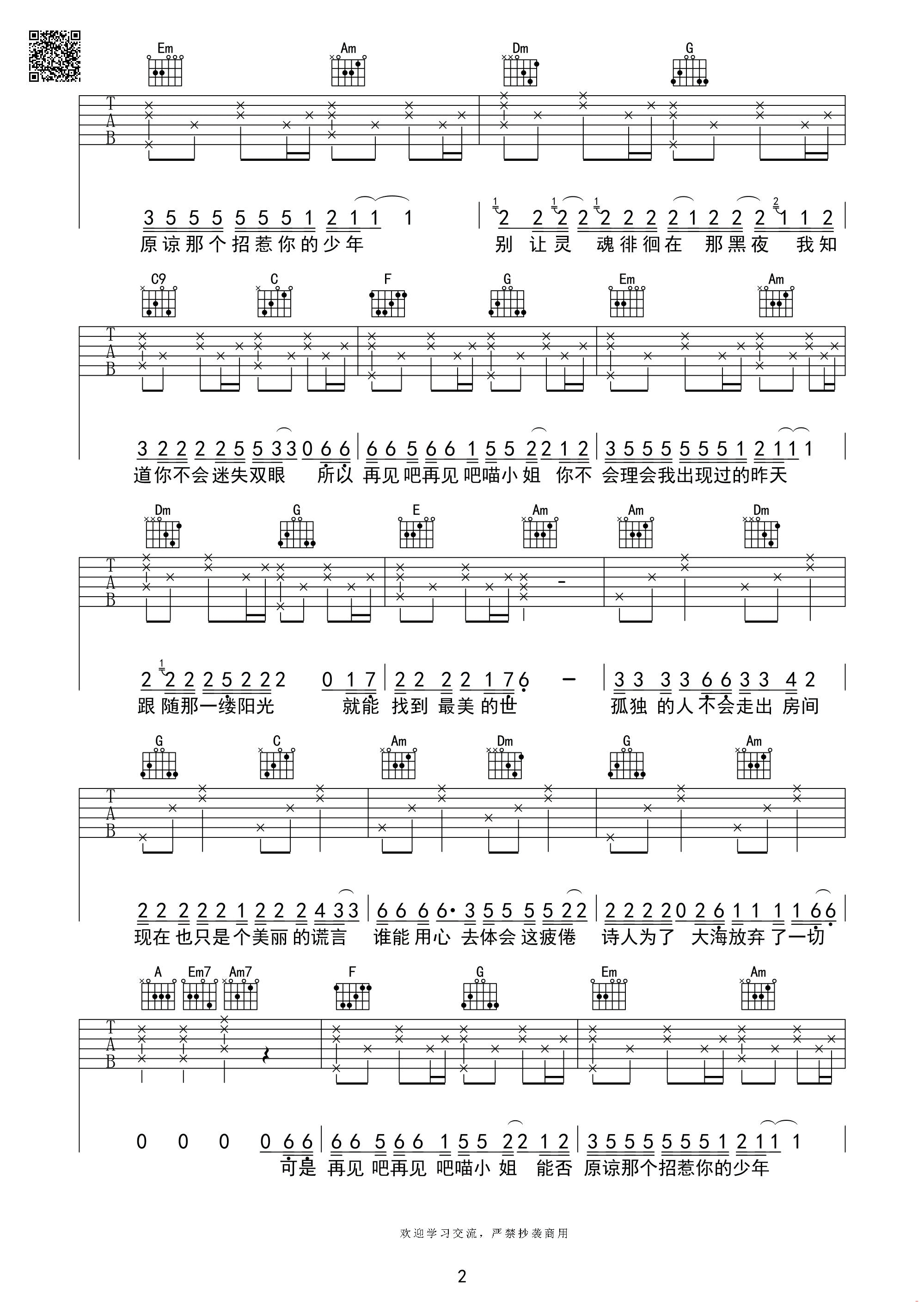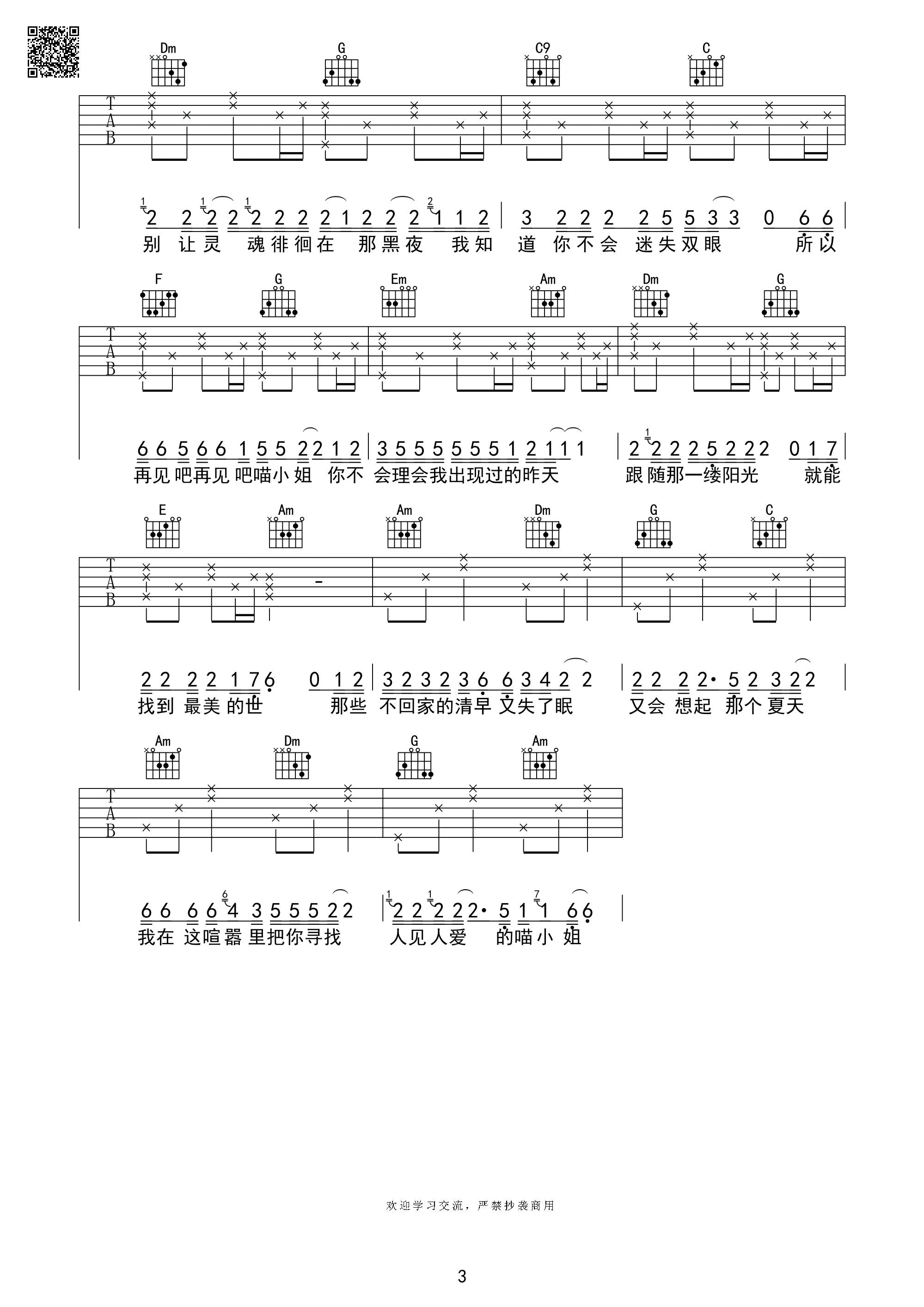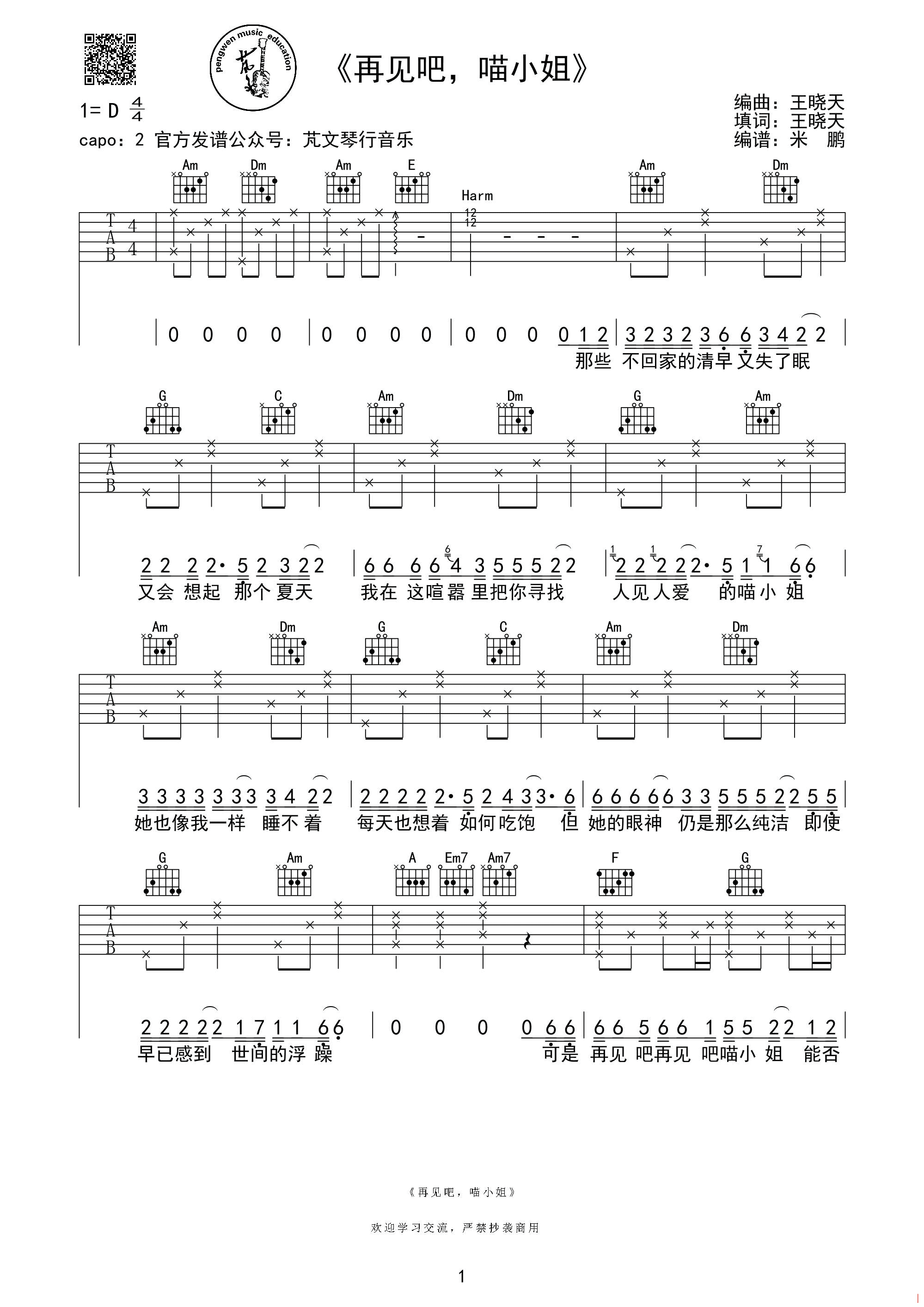 曲谱介绍: 王晓天《再见吧喵小姐》吉他弹唱谱,采用D调指法编配,芃文琴行音乐编配出品,共有3张高清图谱。