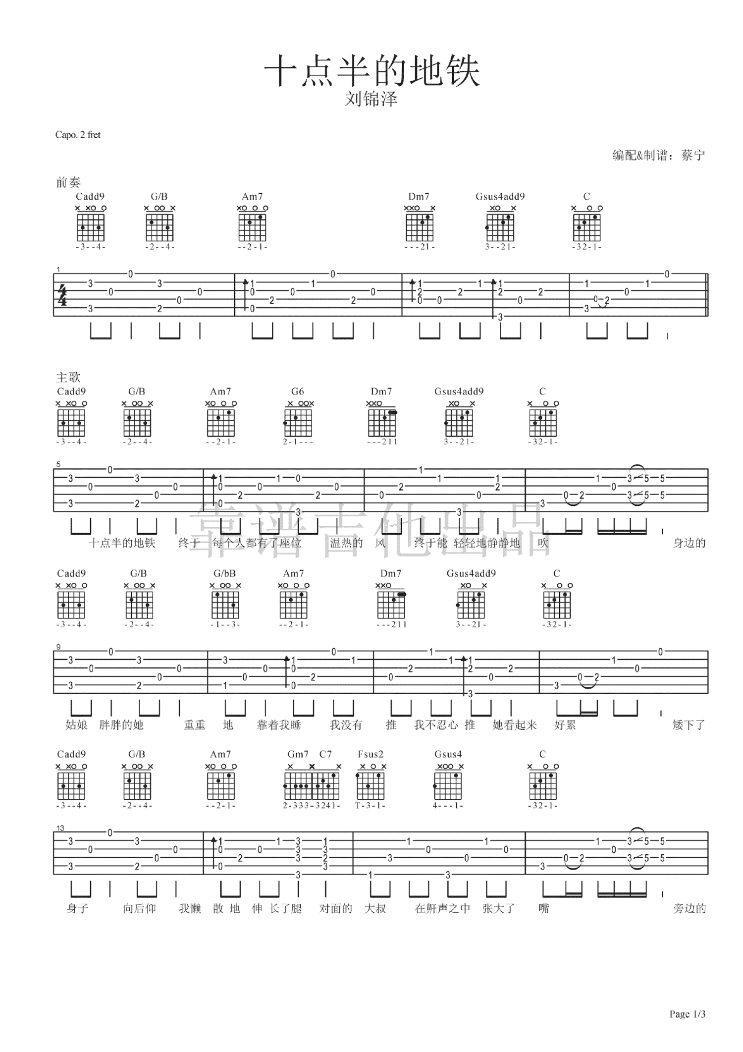 曲谱介绍: 十点半的地铁吉他谱,中国好歌曲刘锦泽词曲演唱,十点半的地铁六线谱,Capo夹二品,