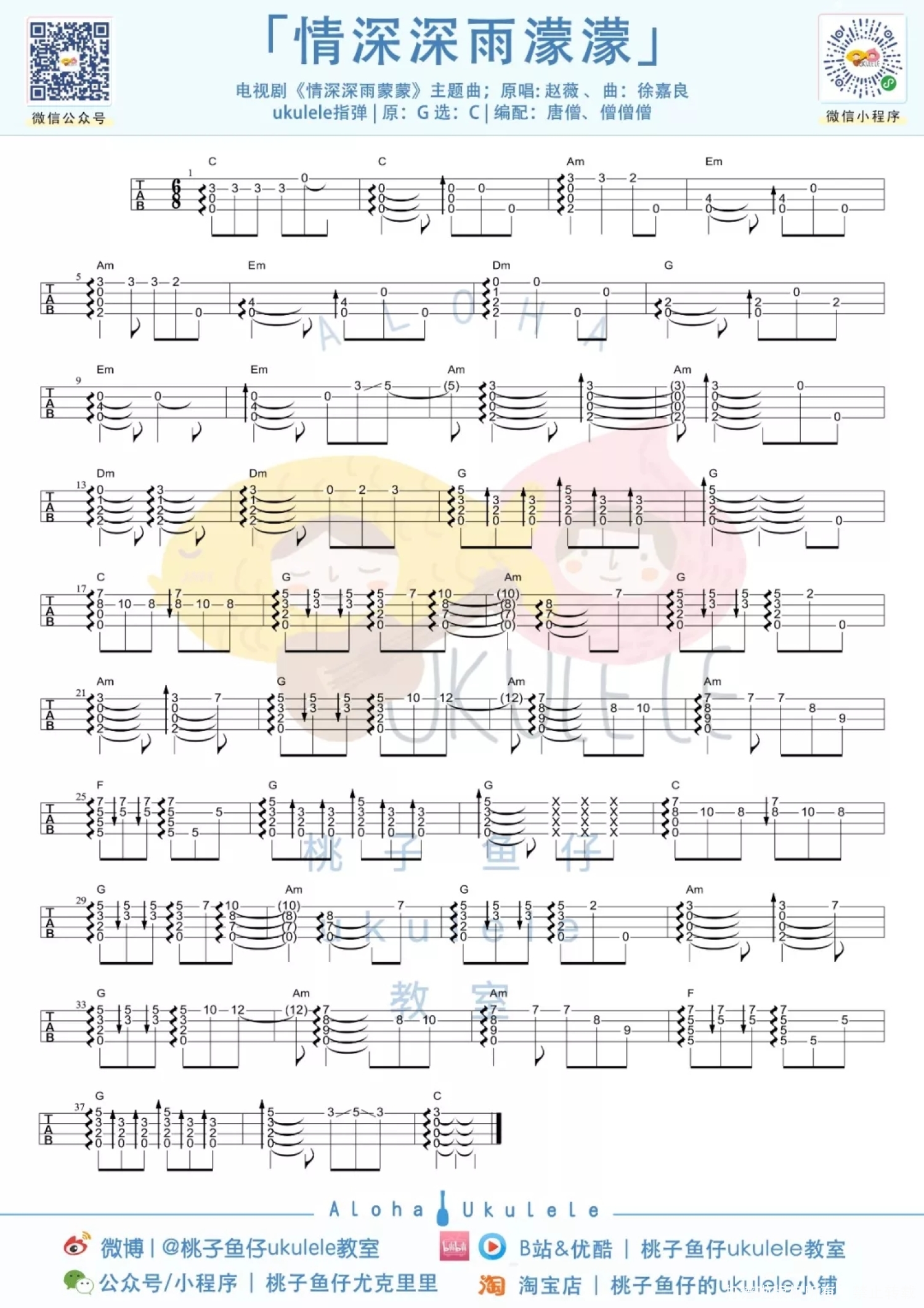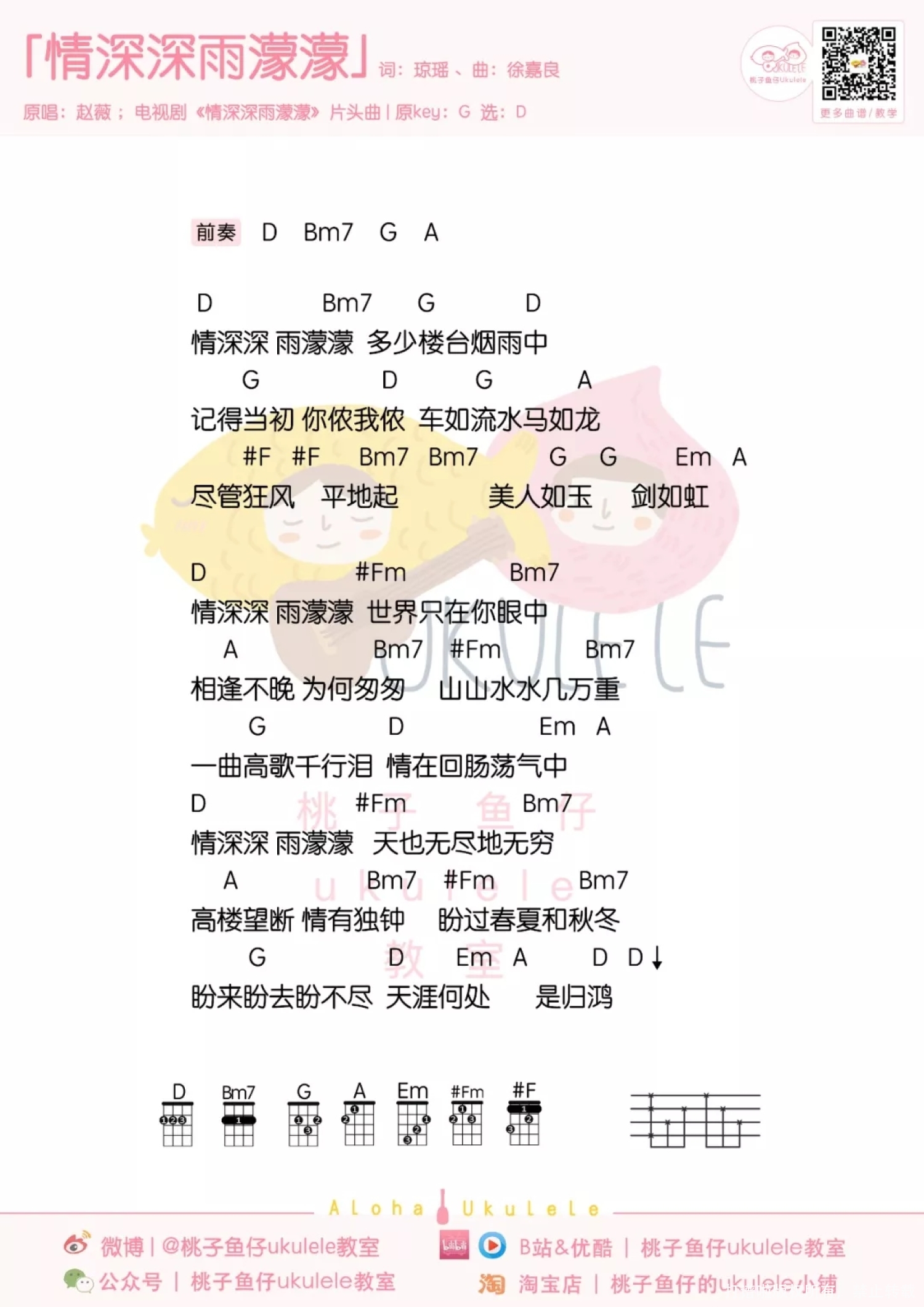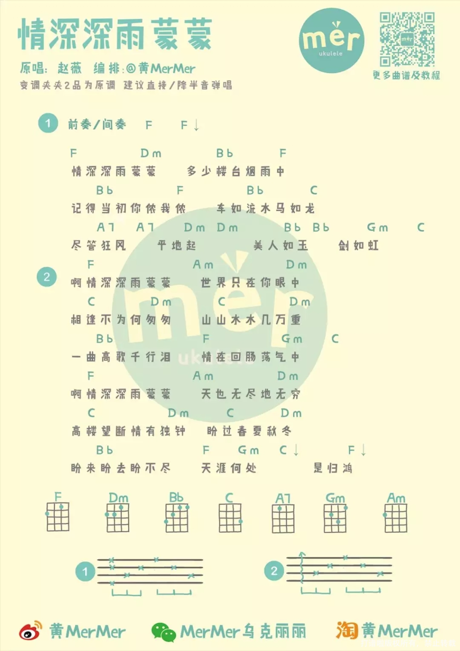 曲谱介绍: 黄mermer版 情深深雨蒙蒙尤克里里 白熊版 情深深雨濛濛乌克丽丽 趣弹蓝调改编版 情深深雨濛濛ukulele 桃子鱼仔版 指弹+弹唱 目录 黄mermer版 情深深雨蒙蒙尤克里里 MerMer说: 为什么突然想要来教这么一首复古又怀旧的歌呢!?主要是被《创造营》里面一位小鲜肉翟潇闻的一段比赛片段洗了脑!明明没有特别高超的唱歌技巧,但就是听得春心荡漾是怎么回事!🙃所以忍不住也来cover一下~ 弹唱   翟潇闻版本   教学   曲谱     白熊版 情深深雨濛濛乌克丽丽 Ukulele弹唱教学@草帽呀   1、情深深雨蒙蒙尤克里里谱F调/G调   2、情深深雨濛濛吉他弹唱谱F调/G调     趣弹蓝调改编版 情深深雨濛濛ukulele   情深深雨濛濛弹唱演示 这一次可爱将这首歌曲进行了改编,让歌曲呈现的偏蓝调,曲风更加轻快,也更为适合小U~ Aloha~ 最近总是突然下起稀里哗啦大雨 一个不小心,就被淋了个透 这雨大概就像是…… 如今再看这部剧,虽然槽点满满,但依旧是我们忘不掉的回忆杀,而且重看一遍,又会发现许多不一样的地方。 比如曾经以为温柔亲切的杜飞,居然也是个毒舌王! 这些老剧总是沉淀着一些宝藏,就比如现在再看,你会发现它变成了你的快乐源泉。再比如里面的歌曲,再听一遍会发现更喜欢了~   情深深雨濛濛弹唱教学   情深深雨濛濛尤克里里谱     桃子鱼仔版 指弹+弹唱 情深深雨蒙蒙ukulele 指弹演示 ukulele指弹教学   情深深雨蒙蒙ukulele指弹谱   弹唱教学   弹唱谱