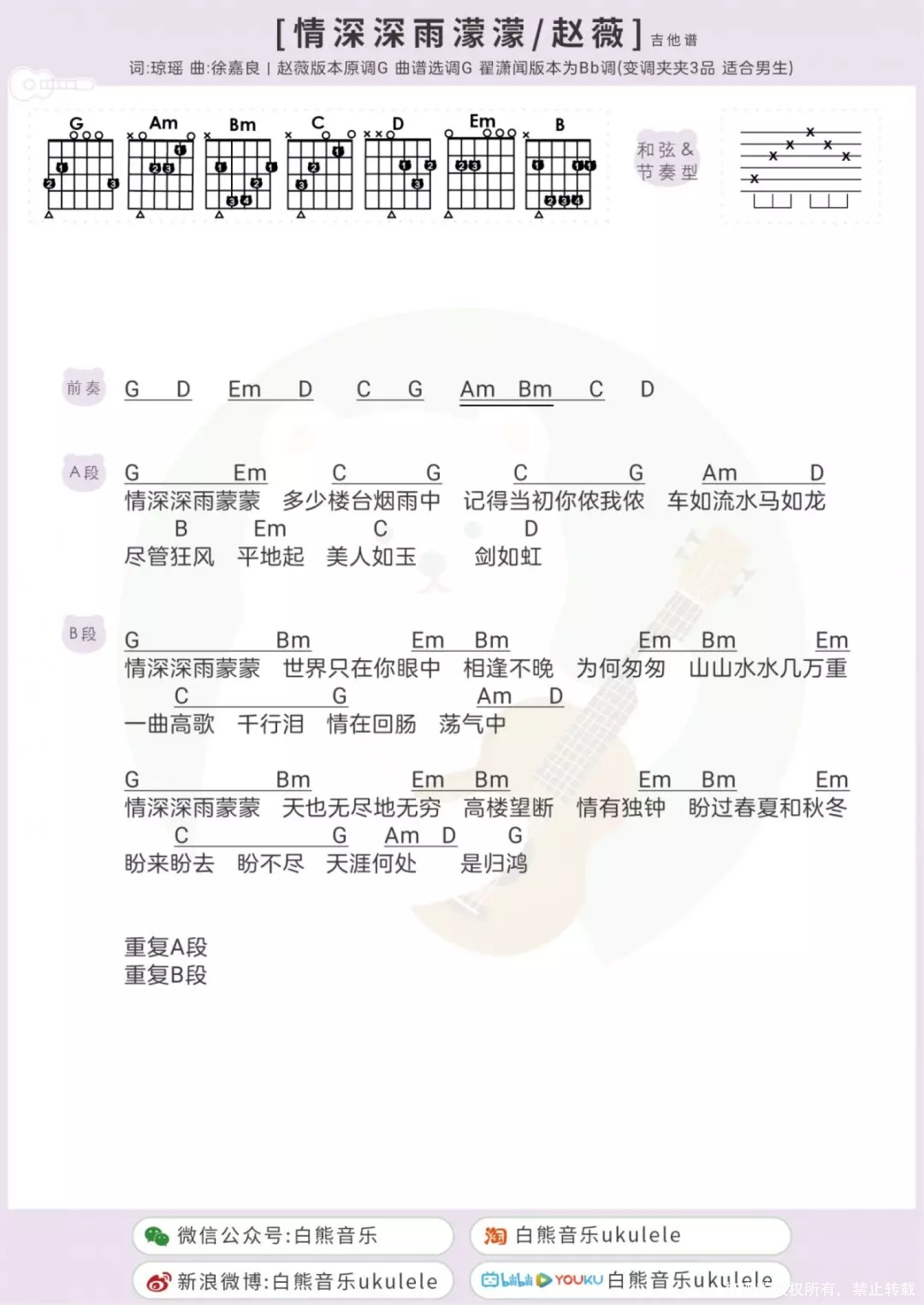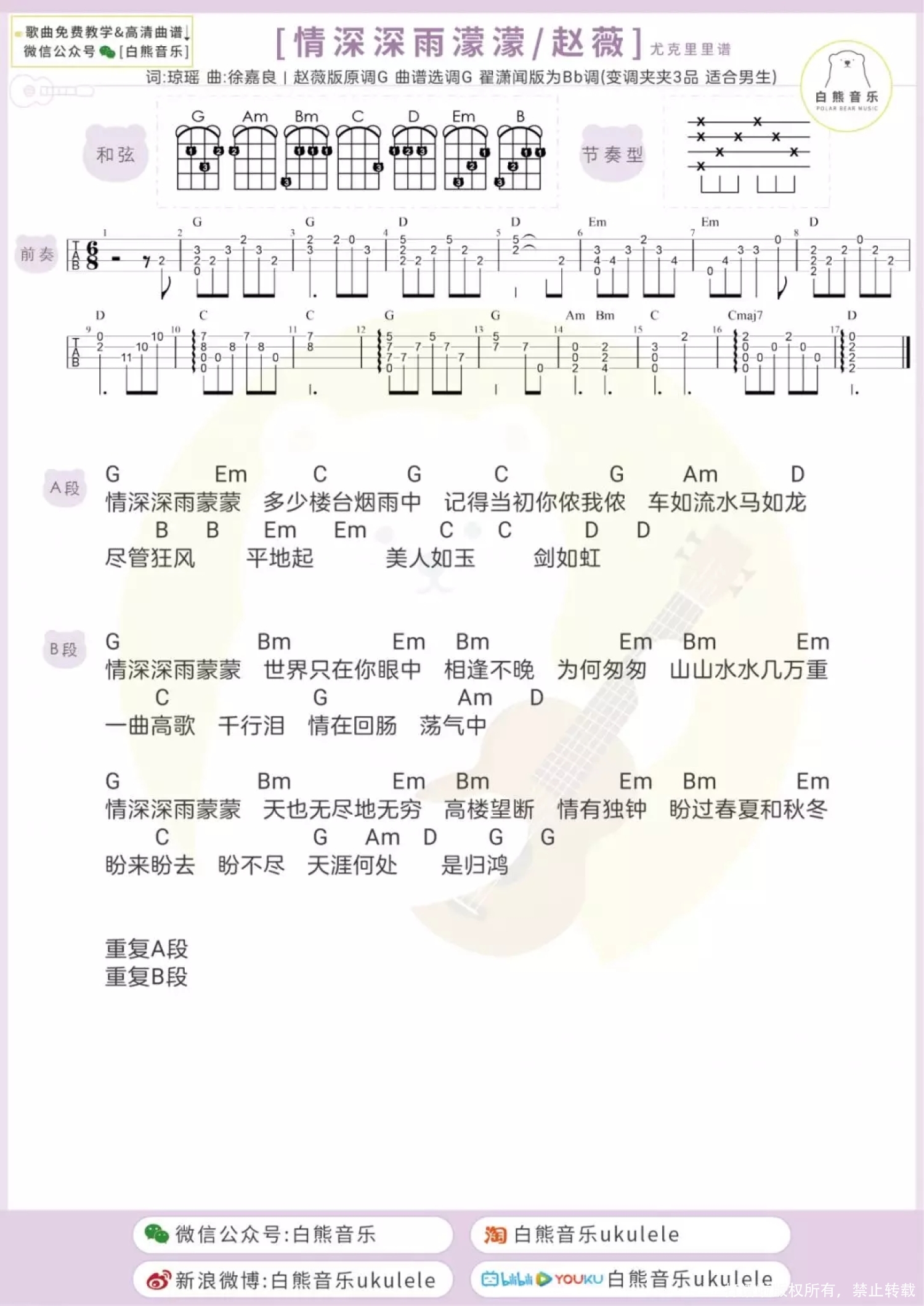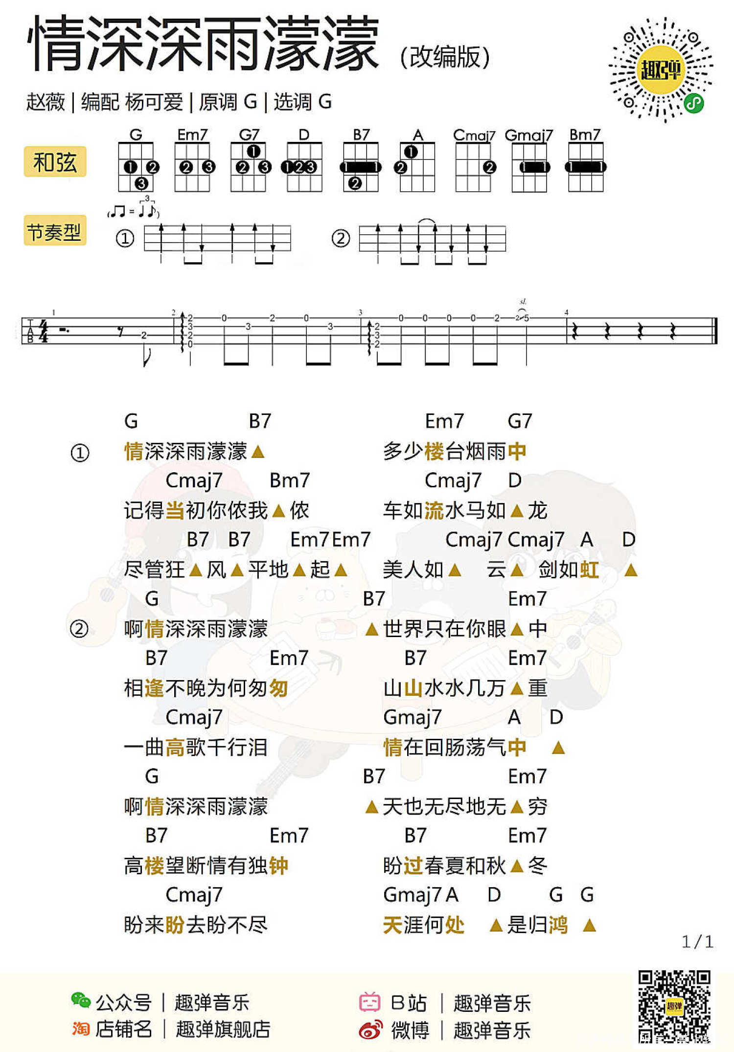 曲谱介绍: 黄mermer版 情深深雨蒙蒙尤克里里 白熊版 情深深雨濛濛乌克丽丽 趣弹蓝调改编版 情深深雨濛濛ukulele 桃子鱼仔版 指弹+弹唱 目录 黄mermer版 情深深雨蒙蒙尤克里里 MerMer说: 为什么突然想要来教这么一首复古又怀旧的歌呢!?主要是被《创造营》里面一位小鲜肉翟潇闻的一段比赛片段洗了脑!明明没有特别高超的唱歌技巧,但就是听得春心荡漾是怎么回事!🙃所以忍不住也来cover一下~ 弹唱   翟潇闻版本   教学   曲谱     白熊版 情深深雨濛濛乌克丽丽 Ukulele弹唱教学@草帽呀   1、情深深雨蒙蒙尤克里里谱F调/G调   2、情深深雨濛濛吉他弹唱谱F调/G调     趣弹蓝调改编版 情深深雨濛濛ukulele   情深深雨濛濛弹唱演示 这一次可爱将这首歌曲进行了改编,让歌曲呈现的偏蓝调,曲风更加轻快,也更为适合小U~ Aloha~ 最近总是突然下起稀里哗啦大雨 一个不小心,就被淋了个透 这雨大概就像是…… 如今再看这部剧,虽然槽点满满,但依旧是我们忘不掉的回忆杀,而且重看一遍,又会发现许多不一样的地方。 比如曾经以为温柔亲切的杜飞,居然也是个毒舌王! 这些老剧总是沉淀着一些宝藏,就比如现在再看,你会发现它变成了你的快乐源泉。再比如里面的歌曲,再听一遍会发现更喜欢了~   情深深雨濛濛弹唱教学   情深深雨濛濛尤克里里谱     桃子鱼仔版 指弹+弹唱 情深深雨蒙蒙ukulele 指弹演示 ukulele指弹教学   情深深雨蒙蒙ukulele指弹谱   弹唱教学   弹唱谱