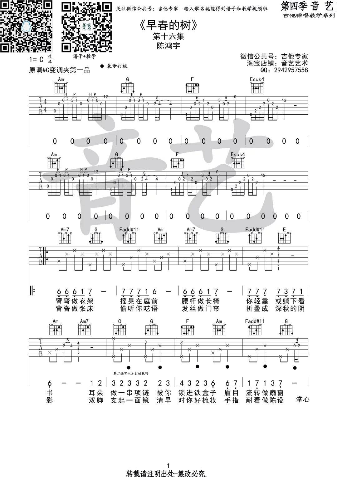 曲谱介绍: 陈鸿宇《早春的树》吉他弹唱谱,采用C调指法编配,音艺吉他专家编配出品,共有3张高清图谱。