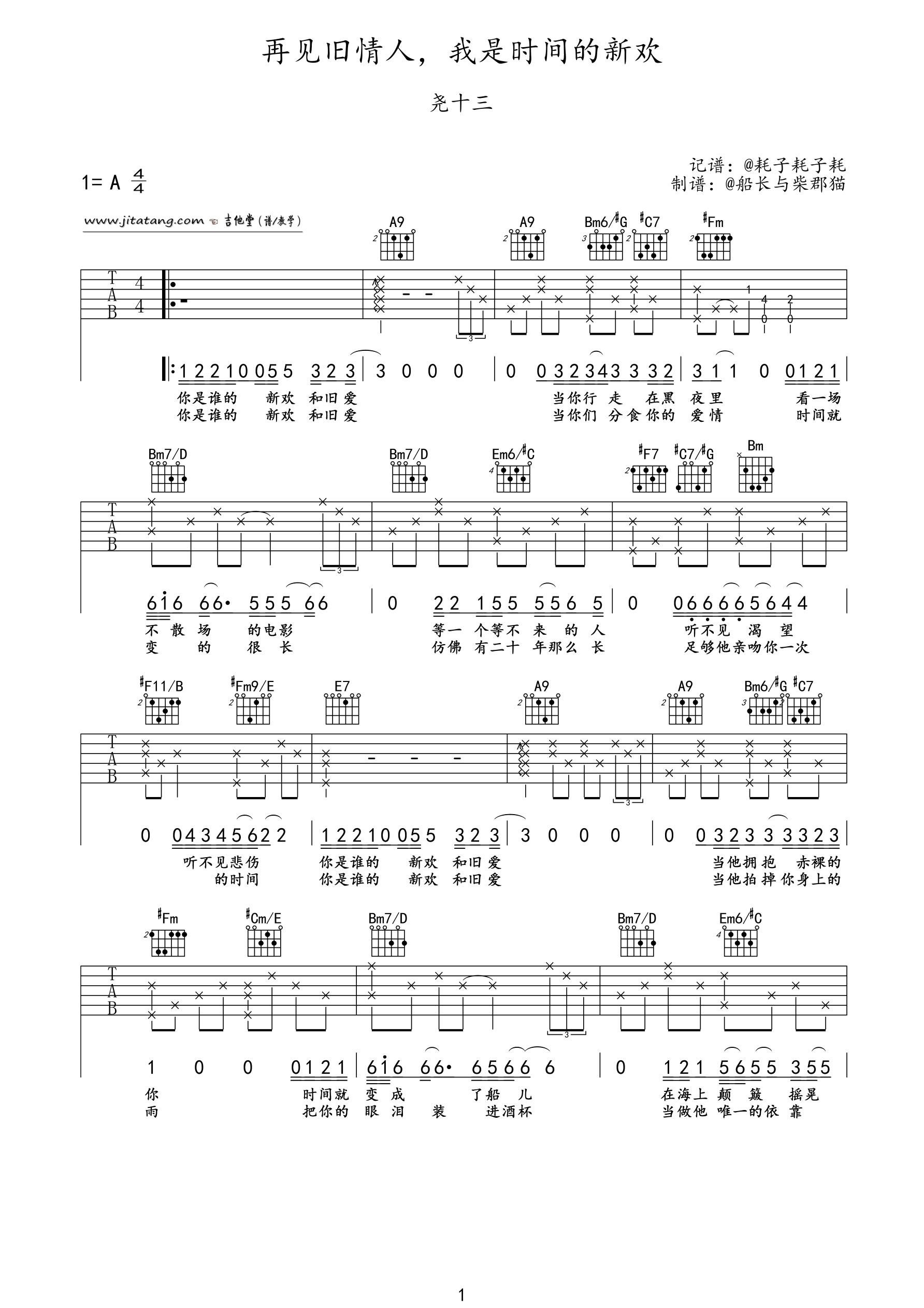 曲谱介绍: 尧十三《再见旧情人我是时间的新欢》吉他弹唱谱,采用A调指法编配,共有3张高清图谱。