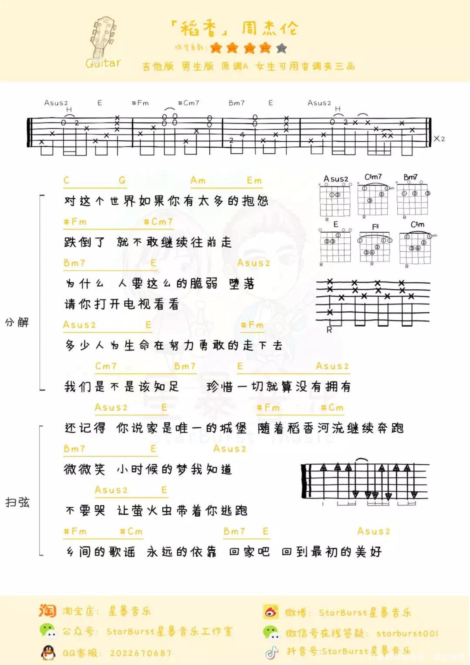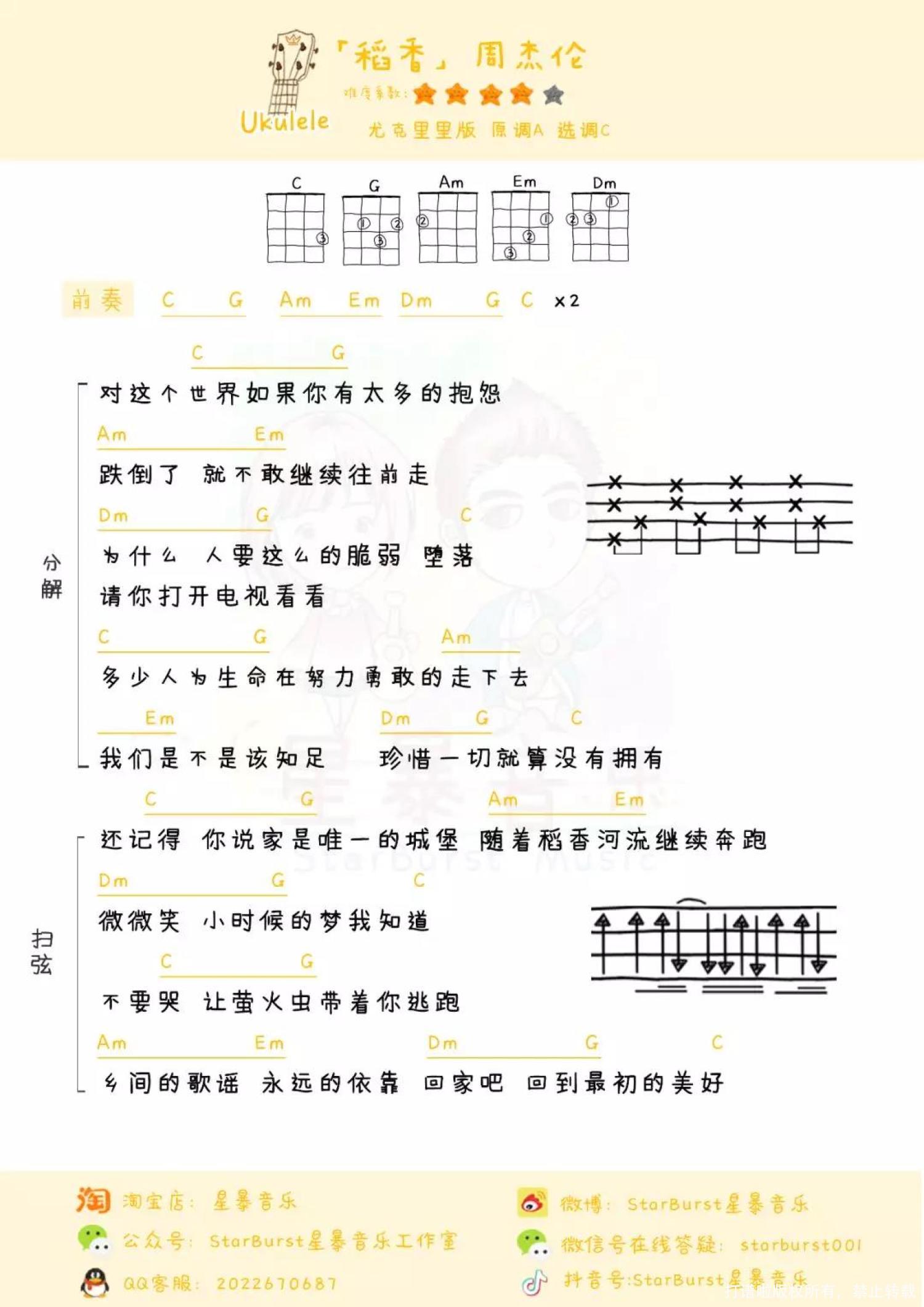 曲谱介绍: 《稻香》以周杰伦小时候的生活经验为创作起源,以玩趣般的歌词带领听众回到乡下。周杰伦在童年时期有很多有趣的事情。 他小时候很羡慕住在乡下的小孩,当家门口种芒果树时,他可以透过窗户看见隔壁邻居翻墙偷芒果。 周杰伦小时候很顽皮,有一次他在大水沟里抓大肚鱼,却不小心摔进水沟里。回家以后,他被妈妈取笑是因为头太大才会掉进去。 尤克里里教学视频 吉他教学视频 尤克里里曲谱 吉他曲谱