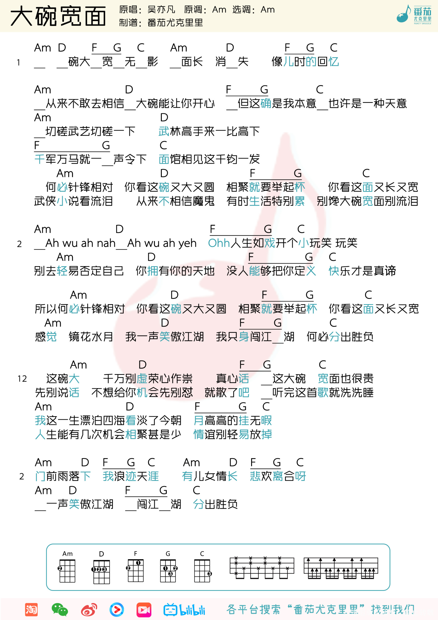 曲谱介绍: 吴亦凡《大碗宽面》尤克里里谱,共有1张高清图谱,免翻页排版设计。