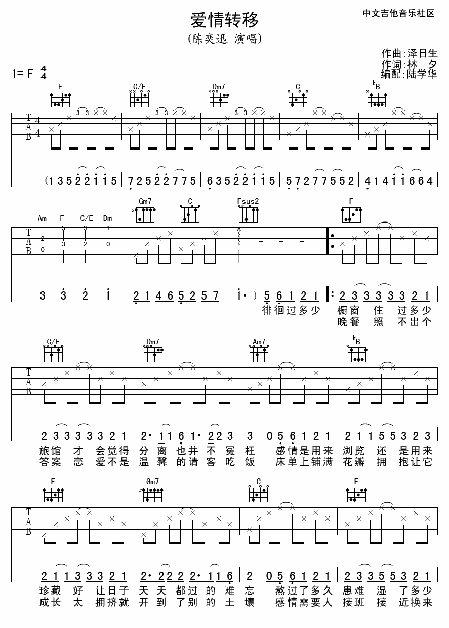 曲谱介绍: 陈奕迅《爱情转移》吉他弹唱谱,采用F调指法编配,中文吉他音乐社区编配出品,共有4张高清图谱。