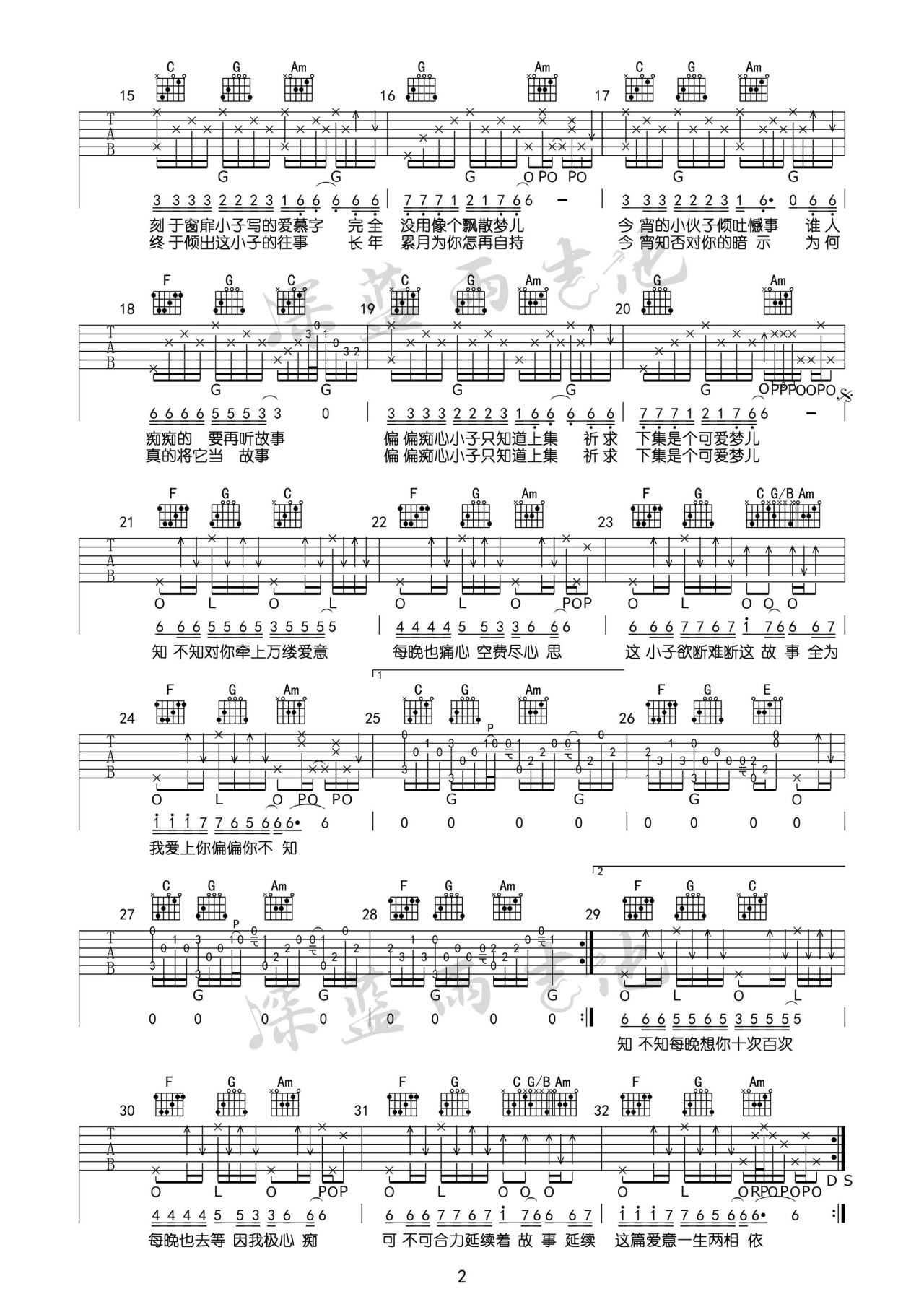 曲谱介绍: 孙耀威《爱的故事上集》吉他弹唱谱,采用C调指法编配,深蓝雨吉他编配出品,共有2张高清图谱,免翻页排版设计。