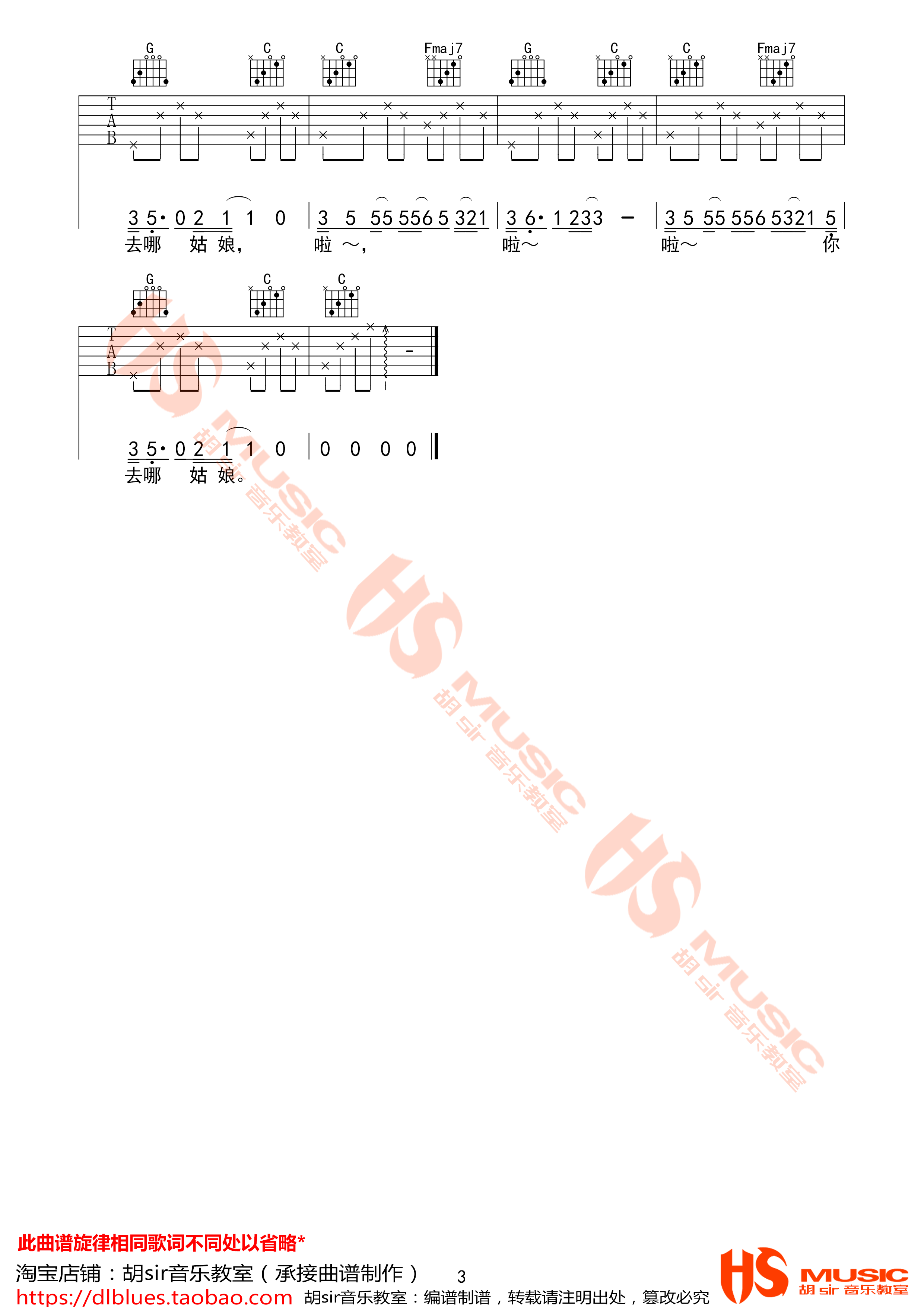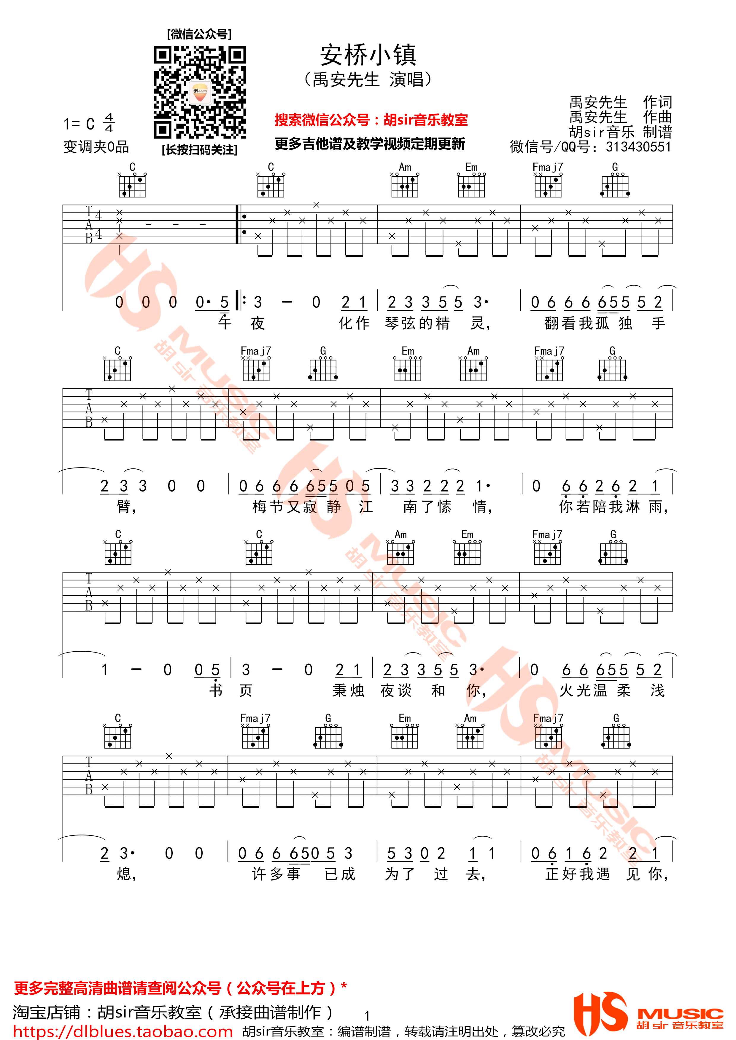 曲谱介绍: 禹安先生《安桥小镇》吉他弹唱谱,采用C调指法编配,胡sir编配出品,共有3张高清图谱。