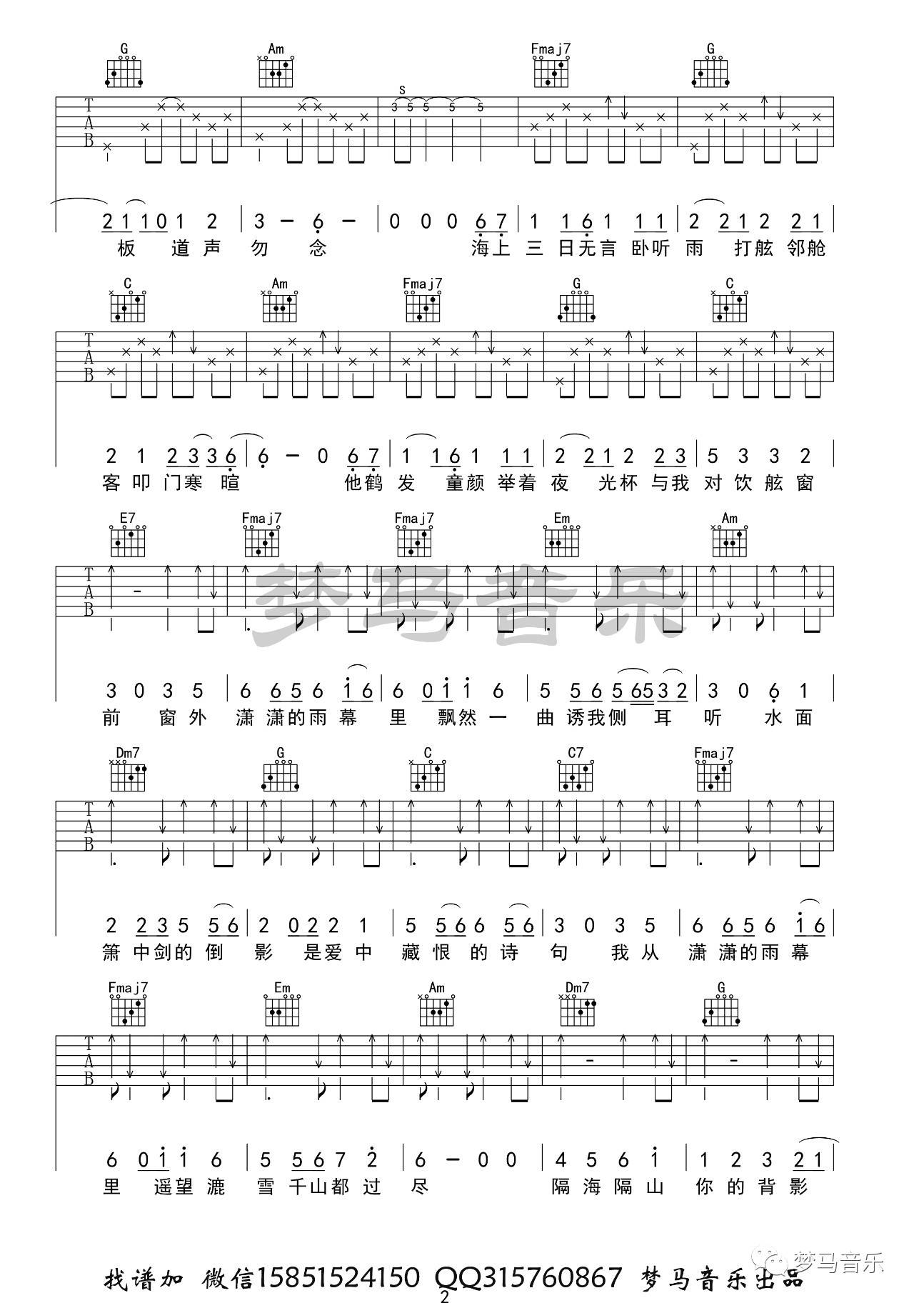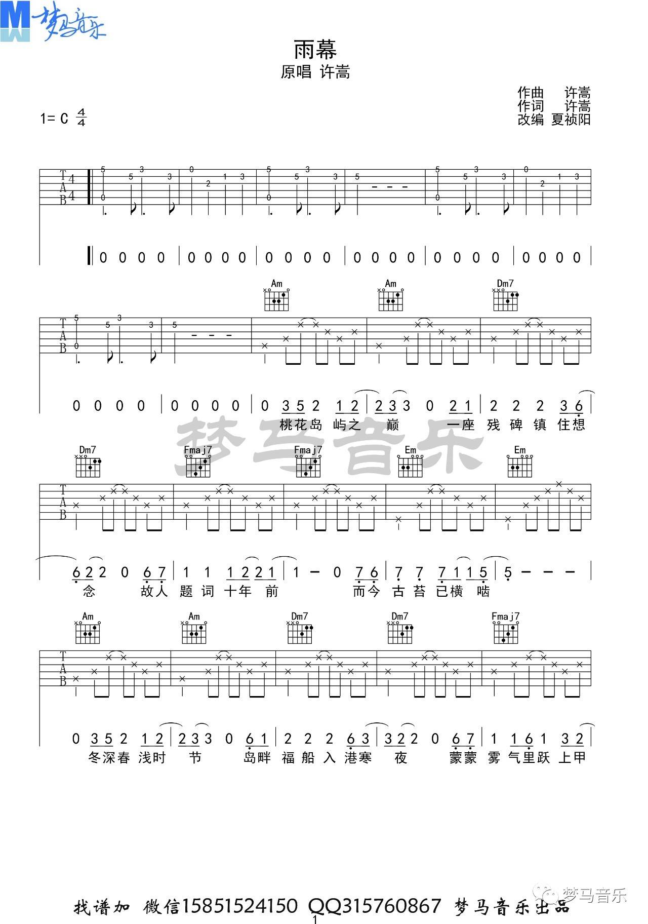曲谱介绍: 许嵩《雨幕》吉他弹唱谱,采用C调指法编配,梦马音乐编配出品,共有3张高清图谱。