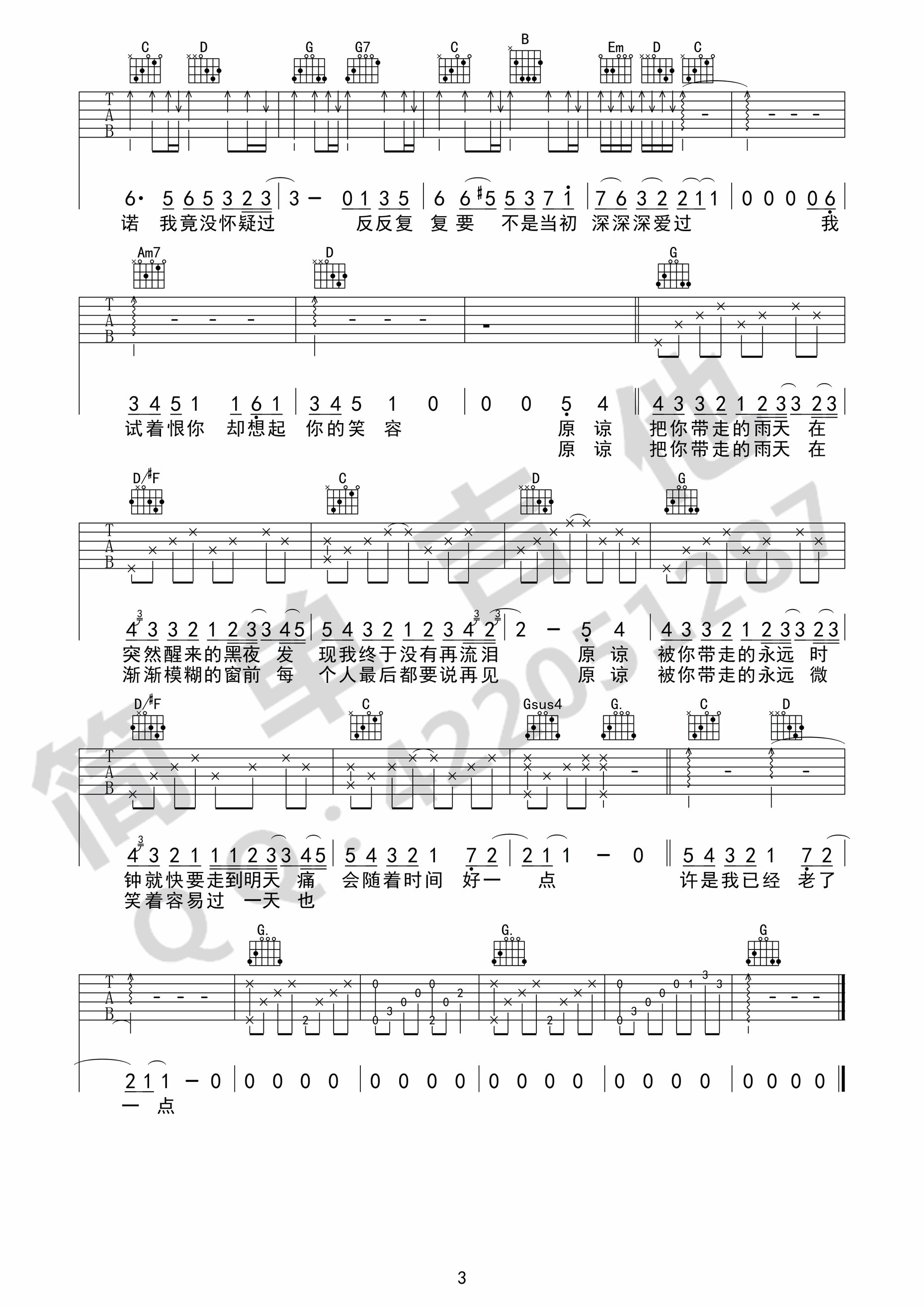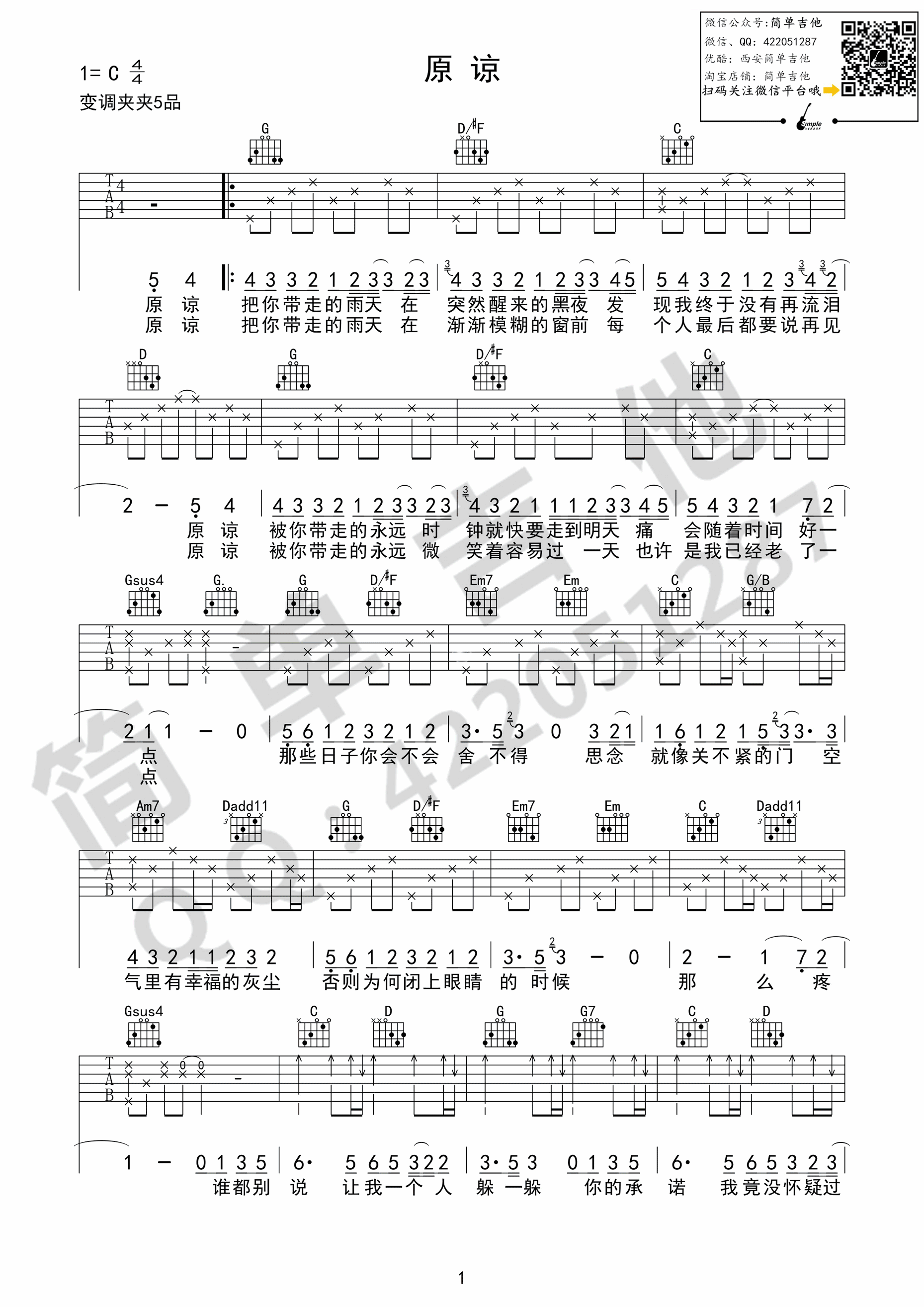 曲谱介绍: 张玉华《原谅》吉他弹唱谱,采用C调指法编配,简单吉他编配出品,共有3张高清图谱。