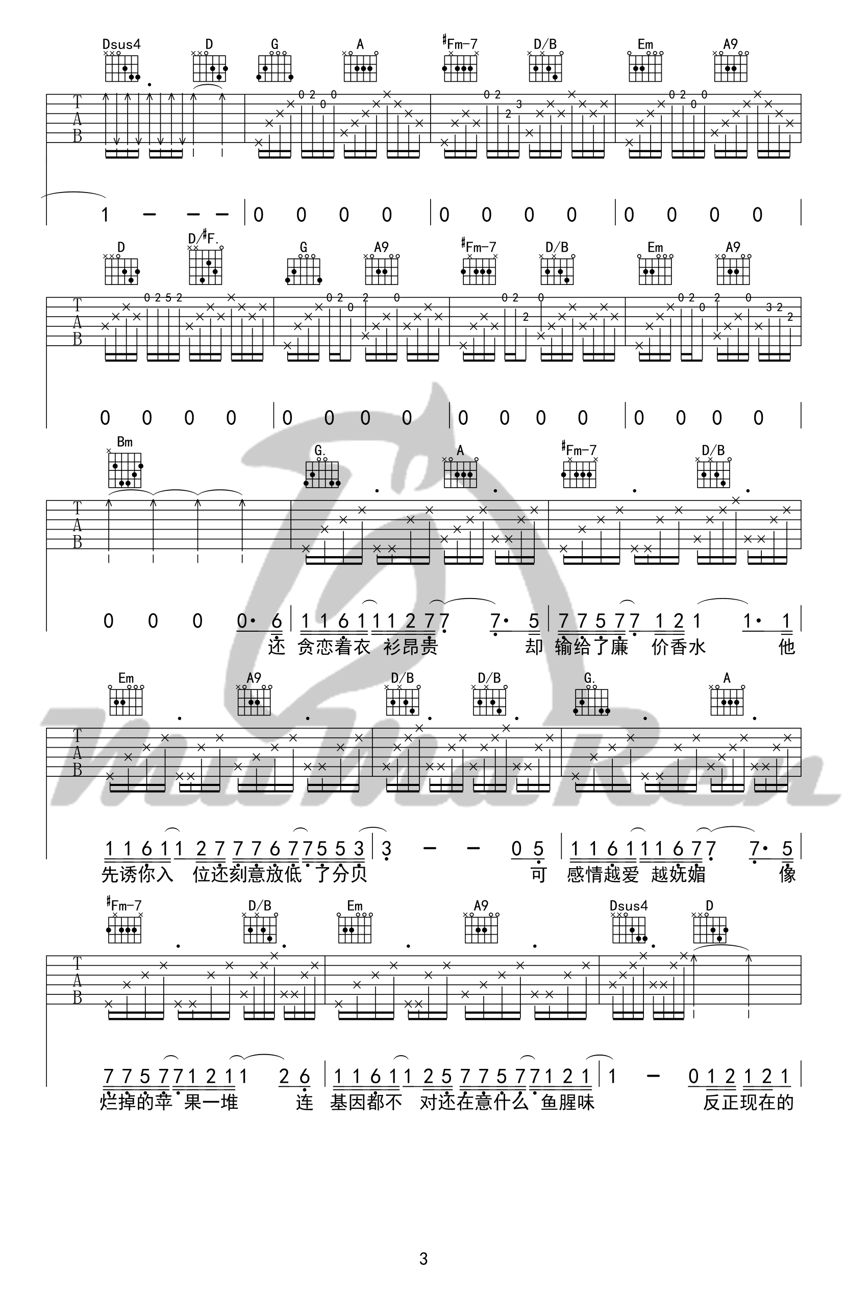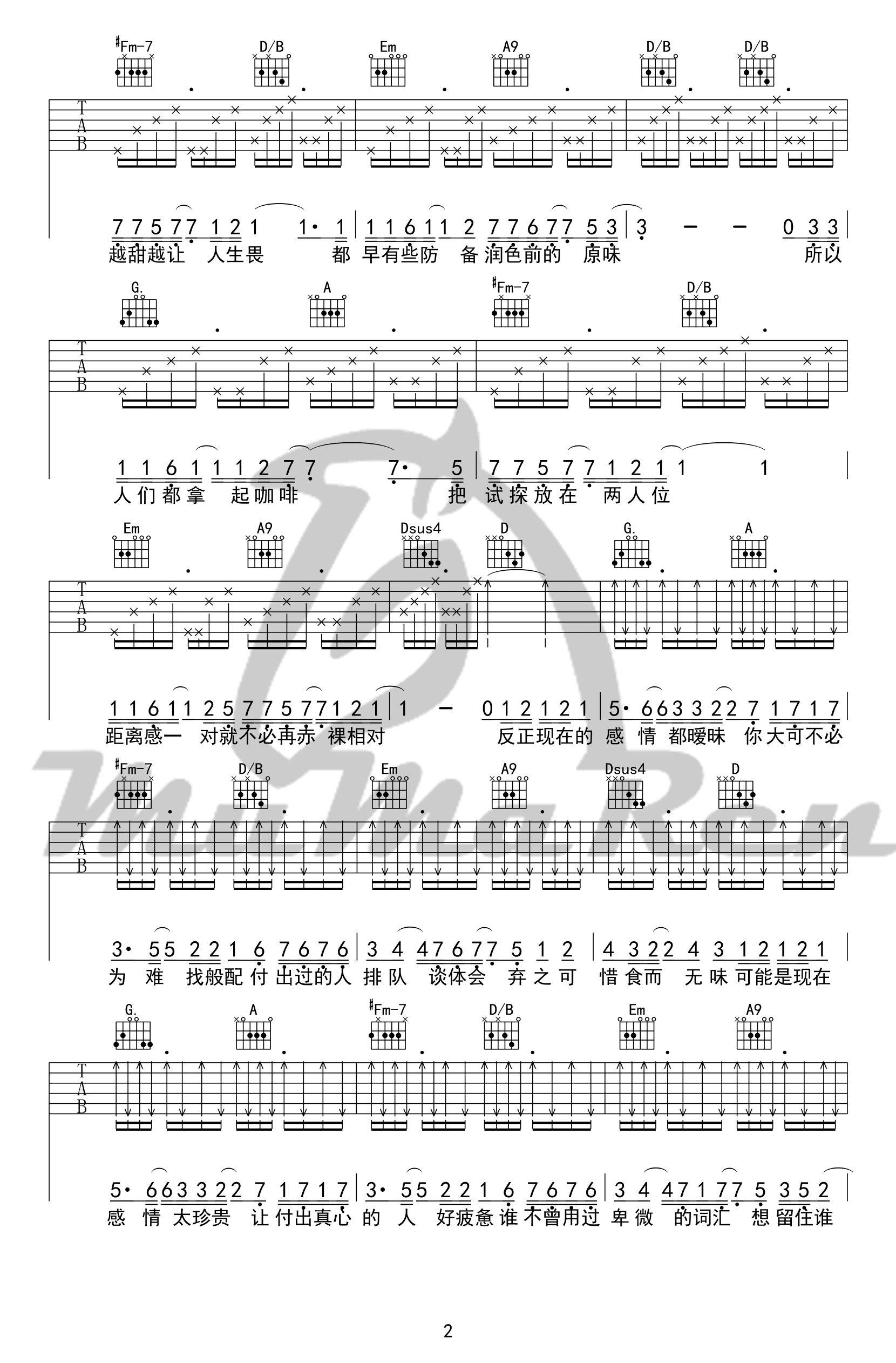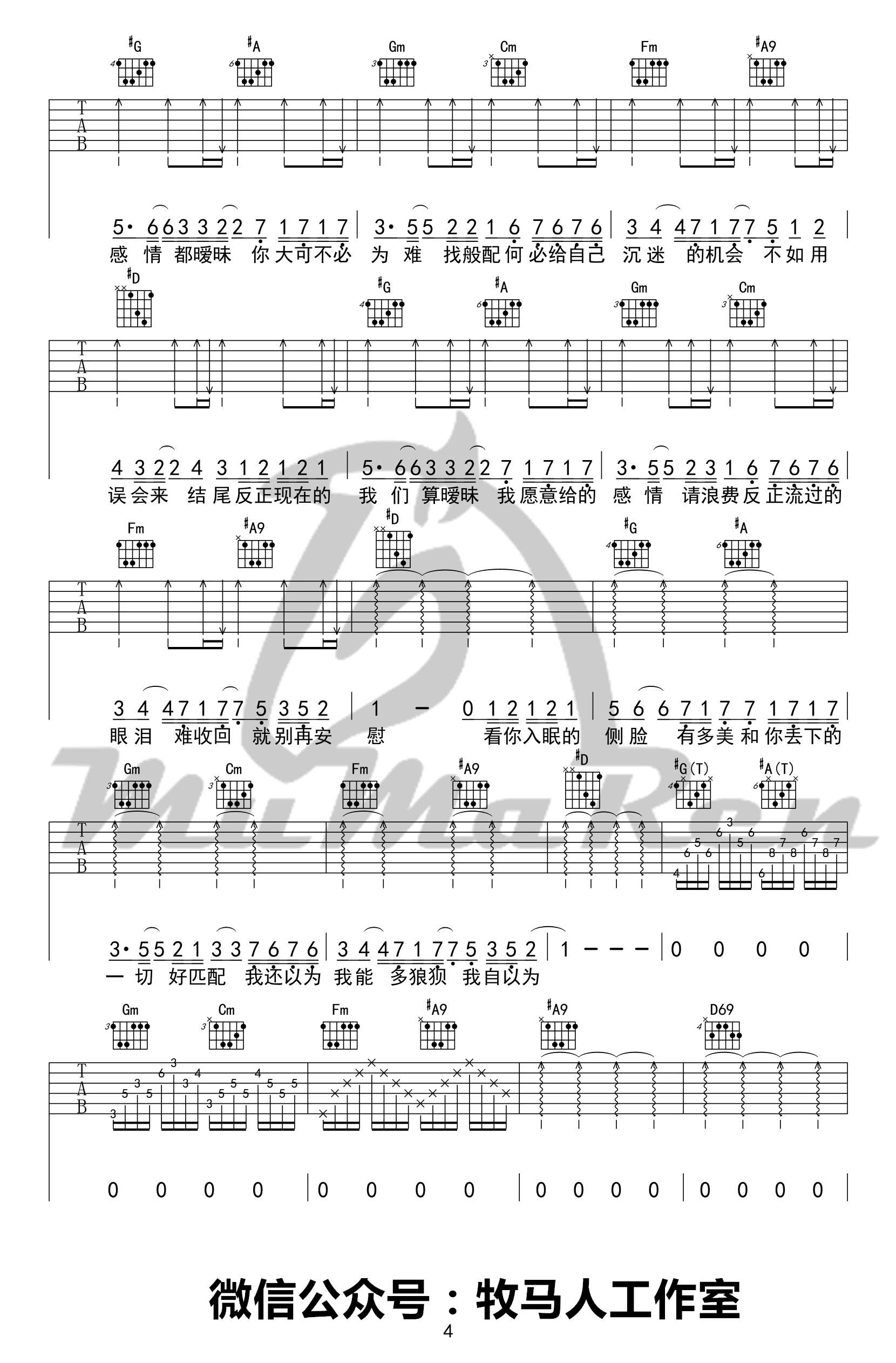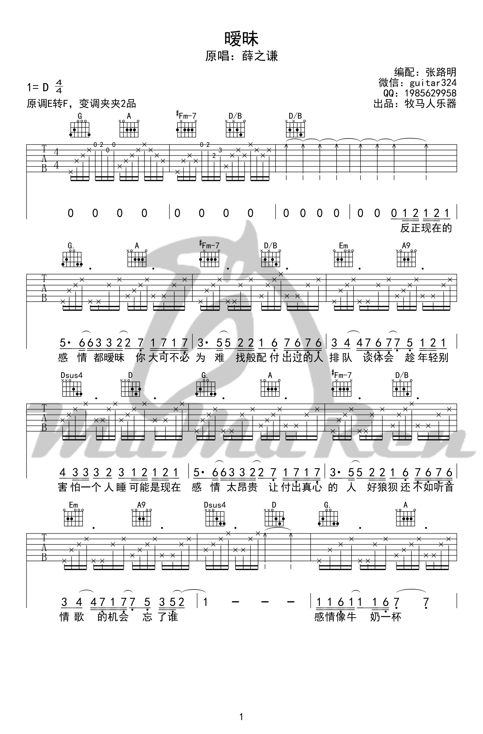 曲谱介绍: 薛之谦《暧昧》吉他弹唱谱,采用D调指法编配,牧马人乐器编配出品,共有4张高清图谱。