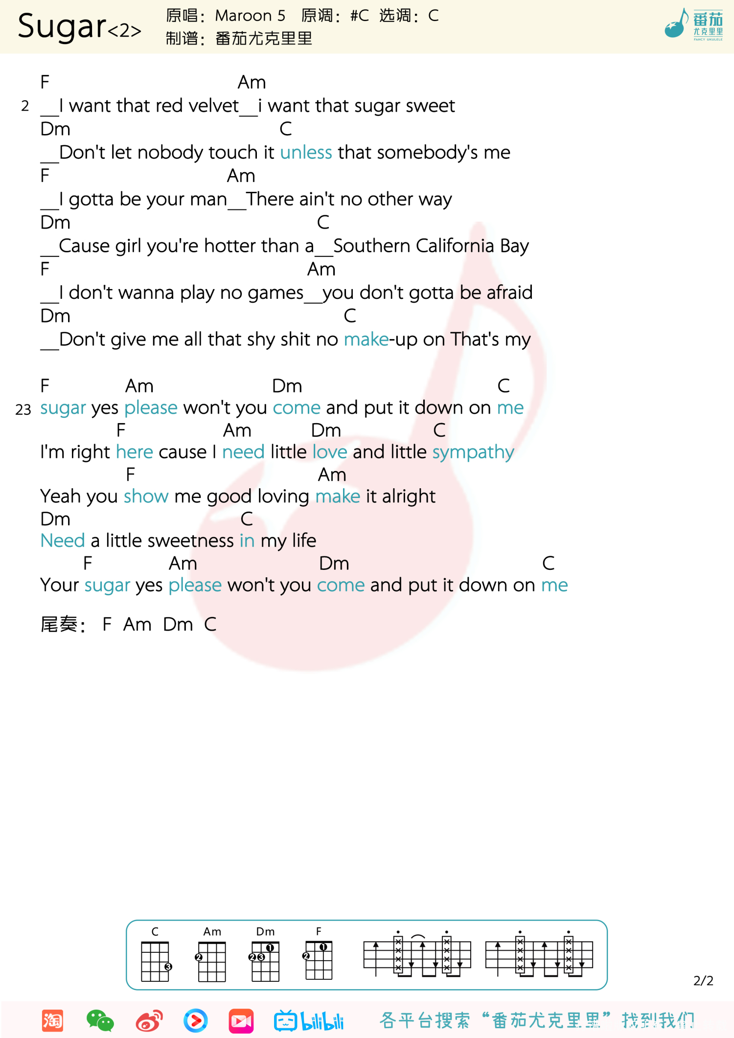曲谱介绍:   「sugar」尤克里里演示   谱子:
