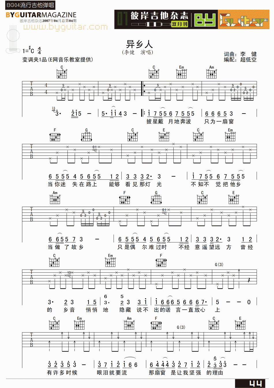 异乡人吉他谱 - 李健 - C调吉他弹唱谱