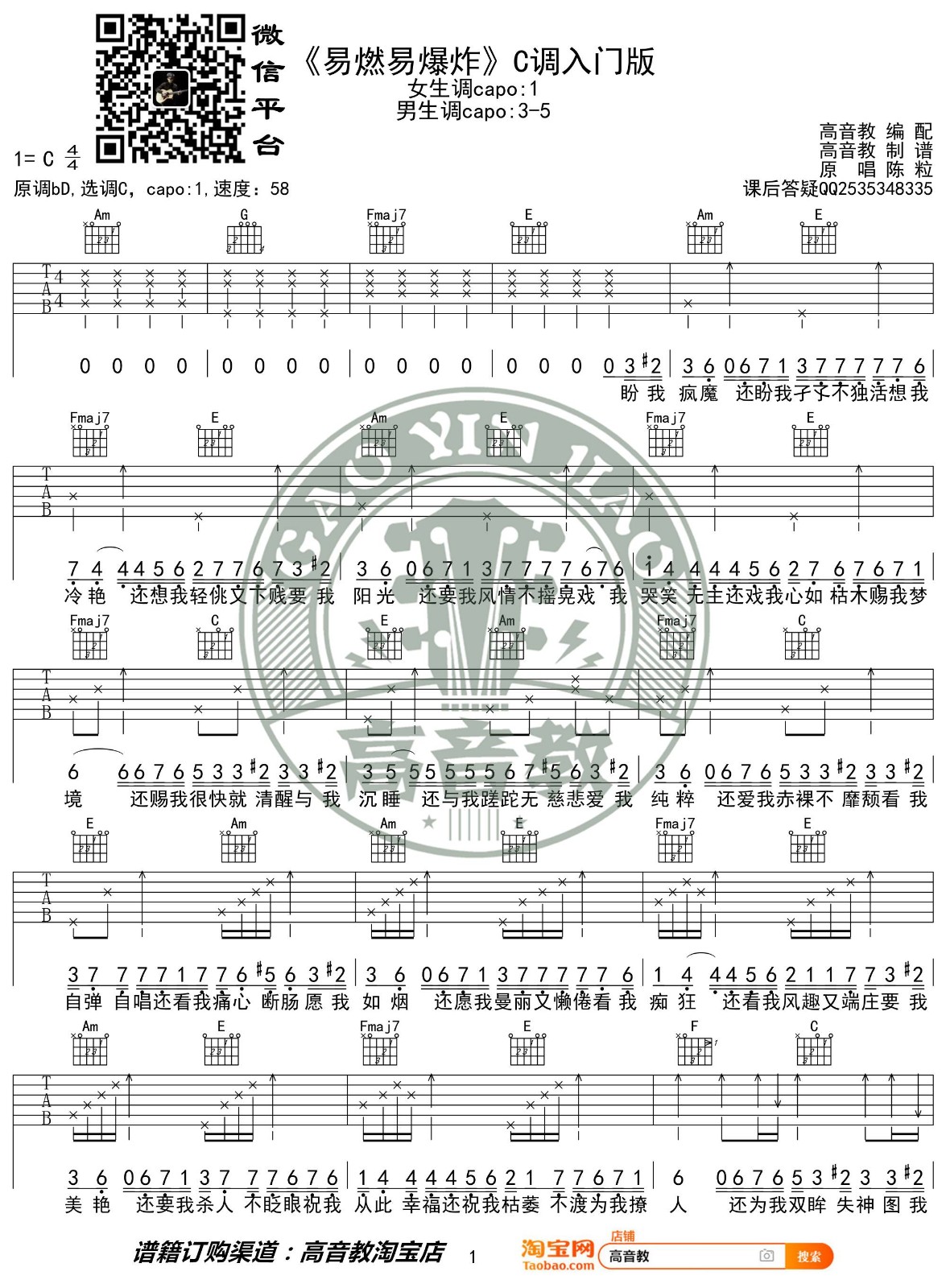 曲谱介绍: 陈粒《易燃易爆炸》吉他弹唱谱,采用C调指法编配,高音教编配出品,共有2张高清图谱,免翻页排版设计。