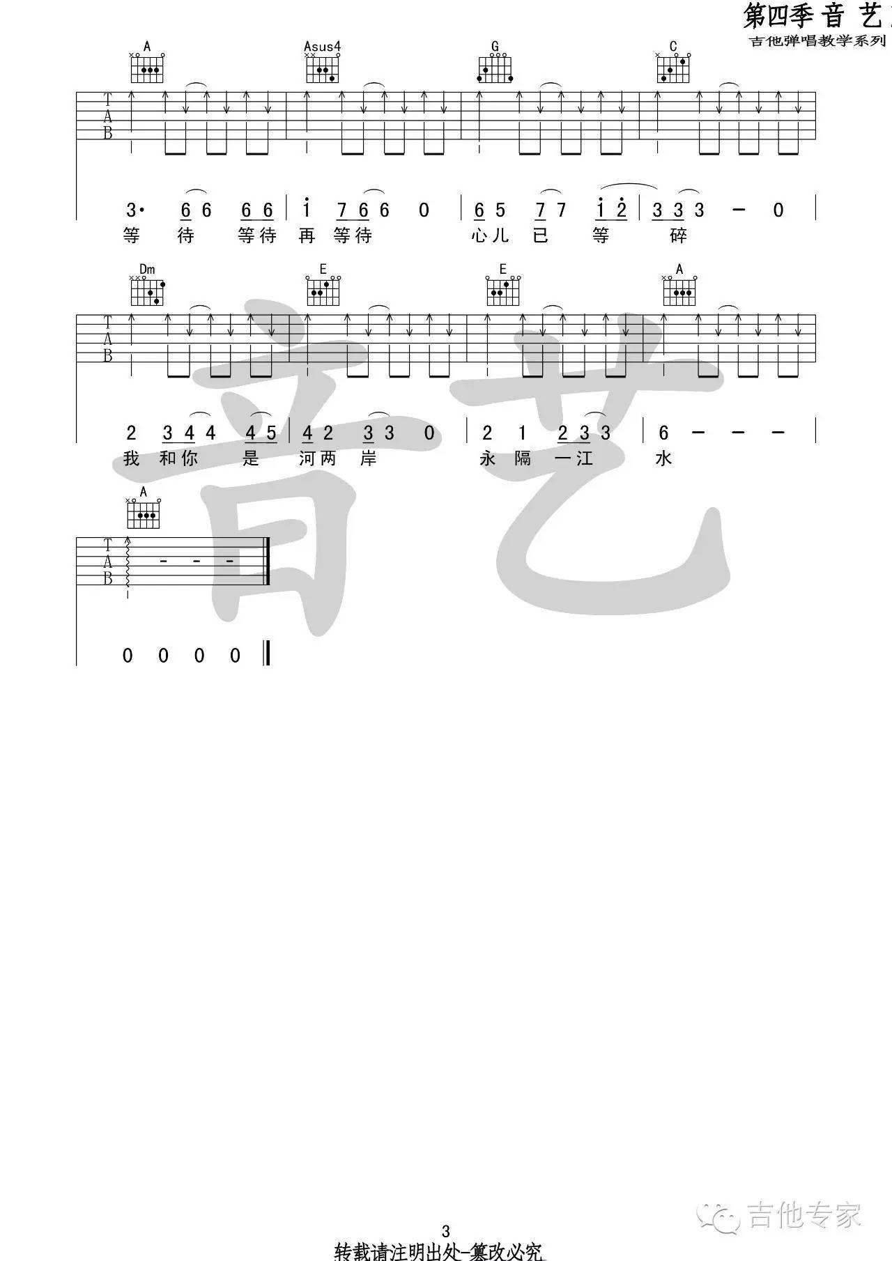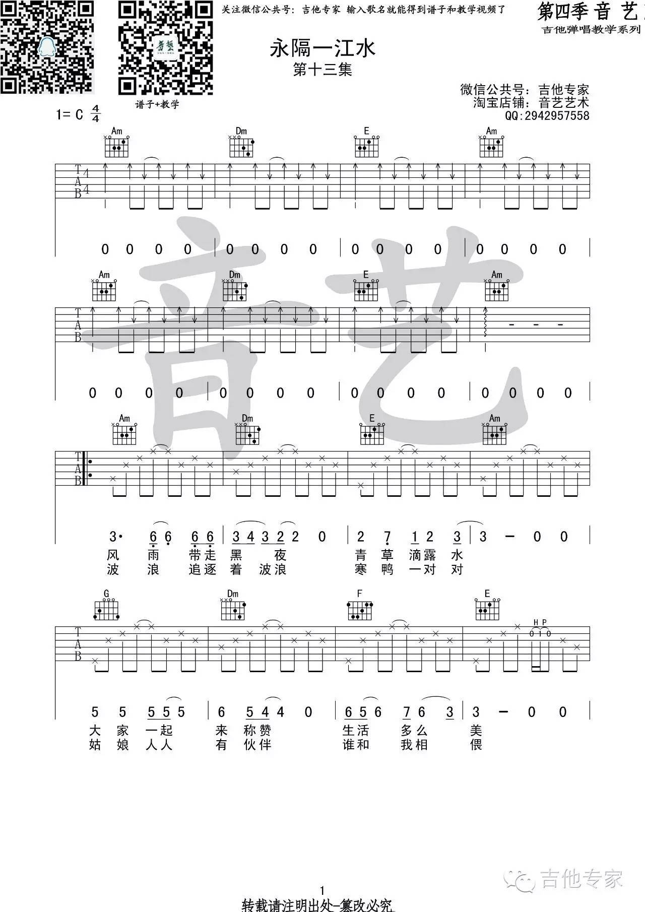 曲谱介绍: 张赫宣《永隔一江水》吉他弹唱谱,采用C调指法编配,音艺吉他编配出品,共有3张高清图谱。