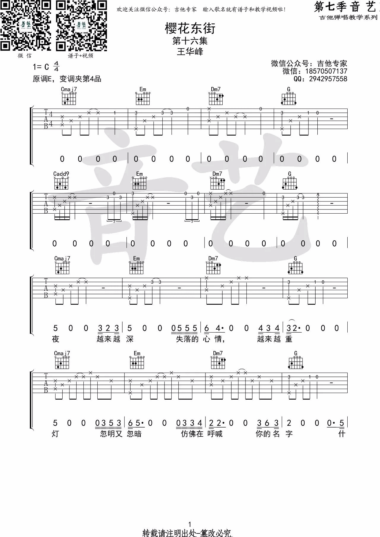 曲谱介绍: 王华峰《樱花东街》吉他弹唱谱,采用C调指法编配,音艺吉他编配出品,共有4张高清图谱。