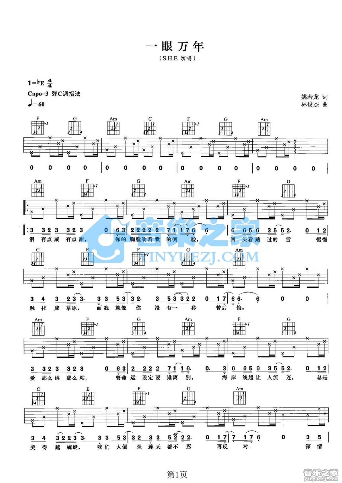 曲谱介绍: S.H.E《一眼万年》吉他弹唱谱,采用C调指法编配,音乐之家编配出品,共有3张高清图谱。