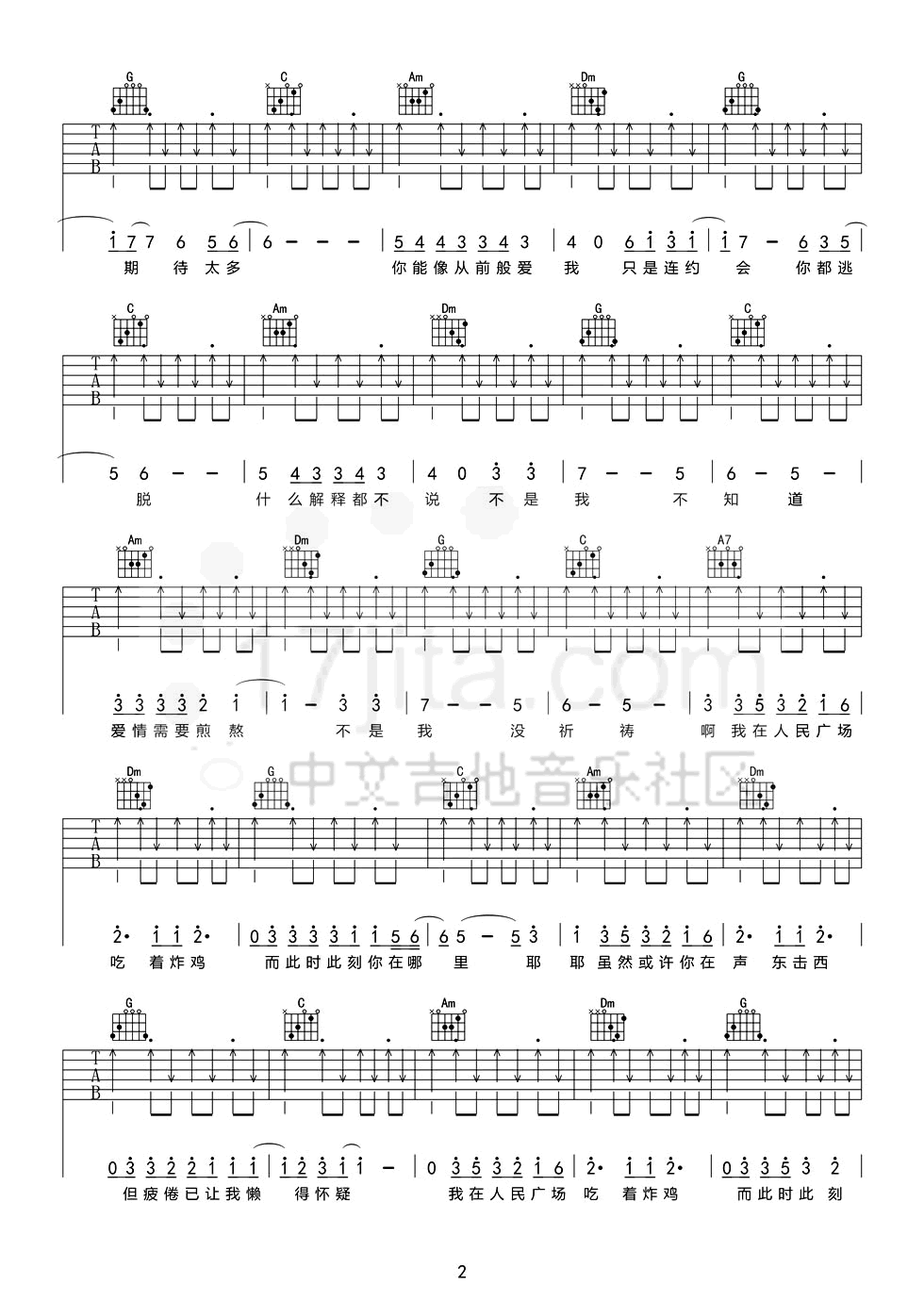 曲谱介绍: 赵大格《我在人民广场吃炸鸡》吉他弹唱谱,采用C调指法编配,中文吉他音乐社区编配出品,共有3张高清图谱。