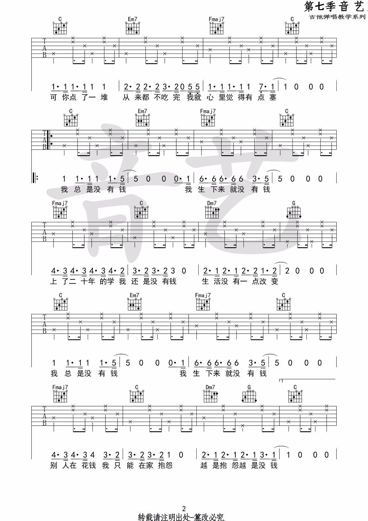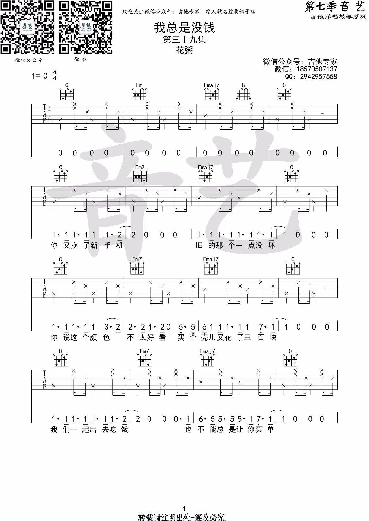 曲谱介绍: 花粥《我总是没钱》吉他弹唱谱,采用C调指法编配,音艺吉他编配出品,共有3张高清图谱。