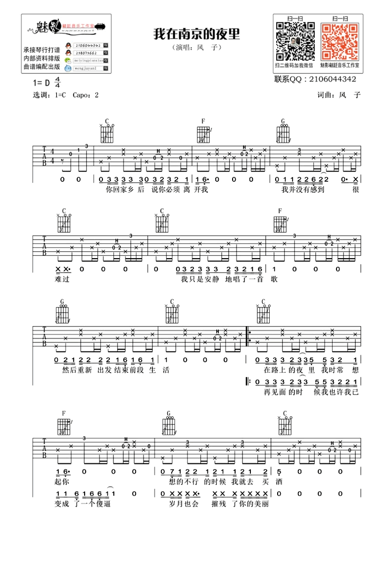 曲谱介绍: 风子《我在南京的夜里》吉他弹唱谱,采用C调指法编配,魅影翩跹编配出品,共有3张高清图谱。