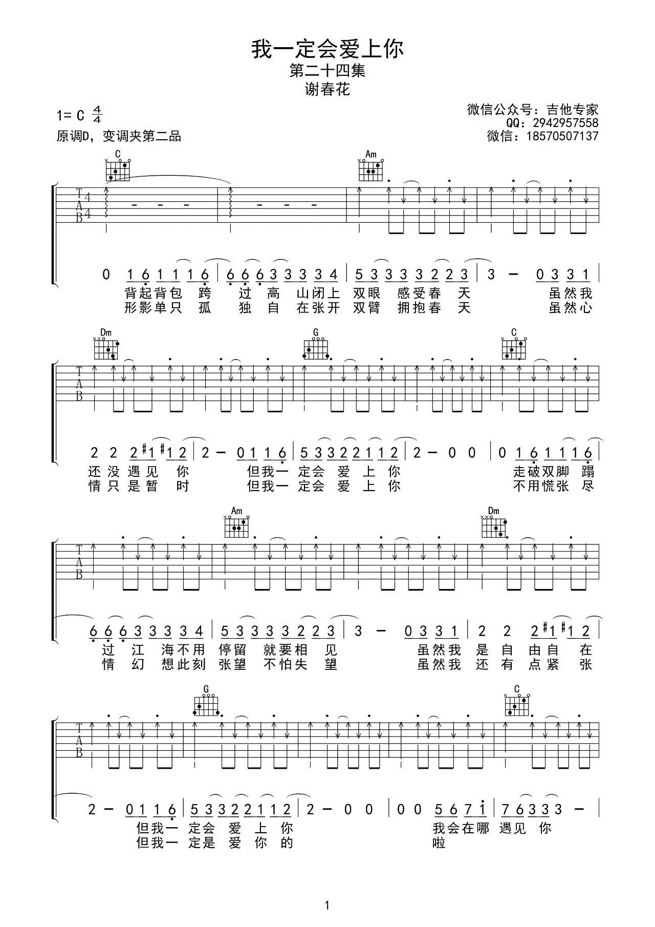 我一定会爱上你吉他谱 - 谢春花 - C调吉他弹唱谱