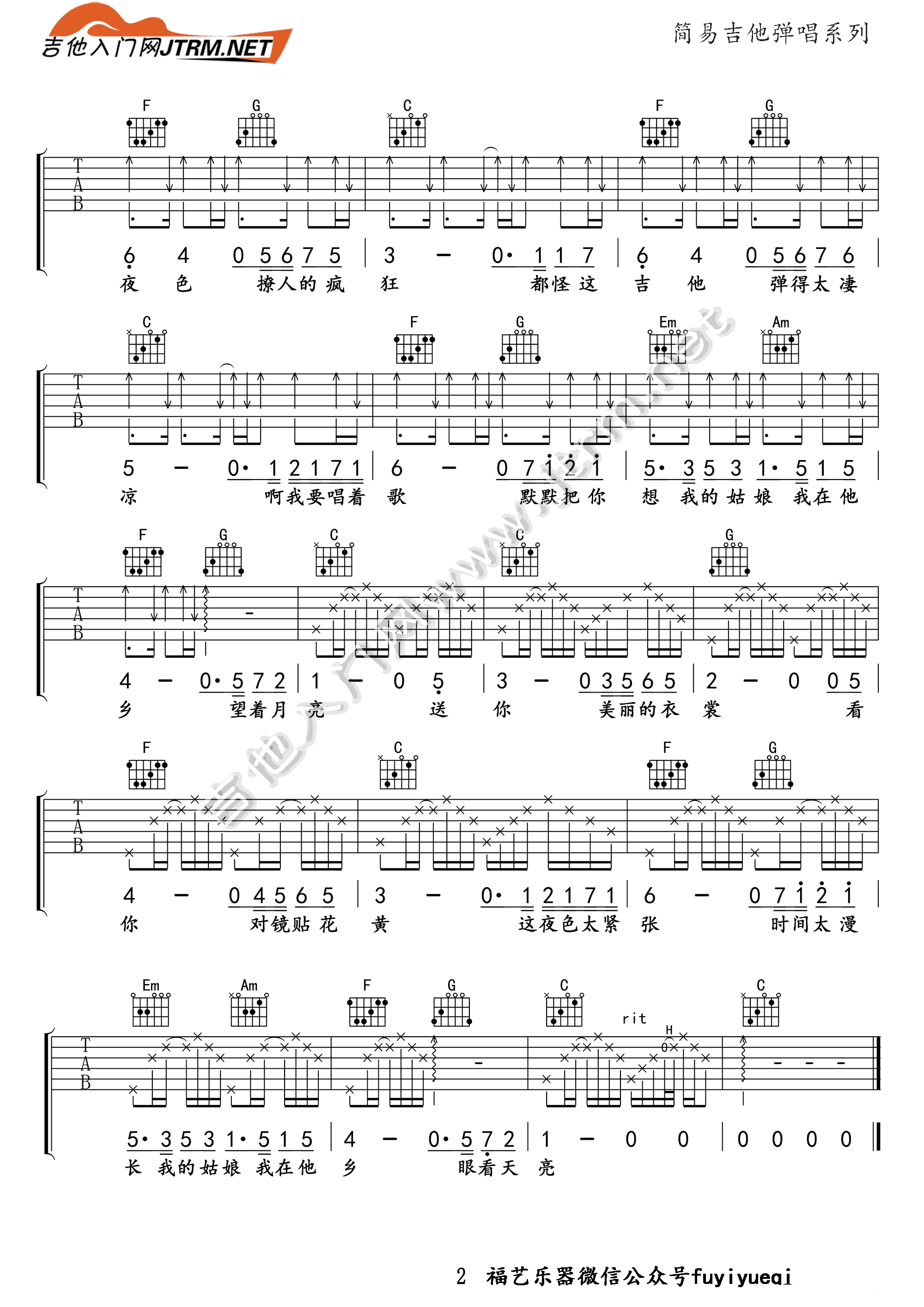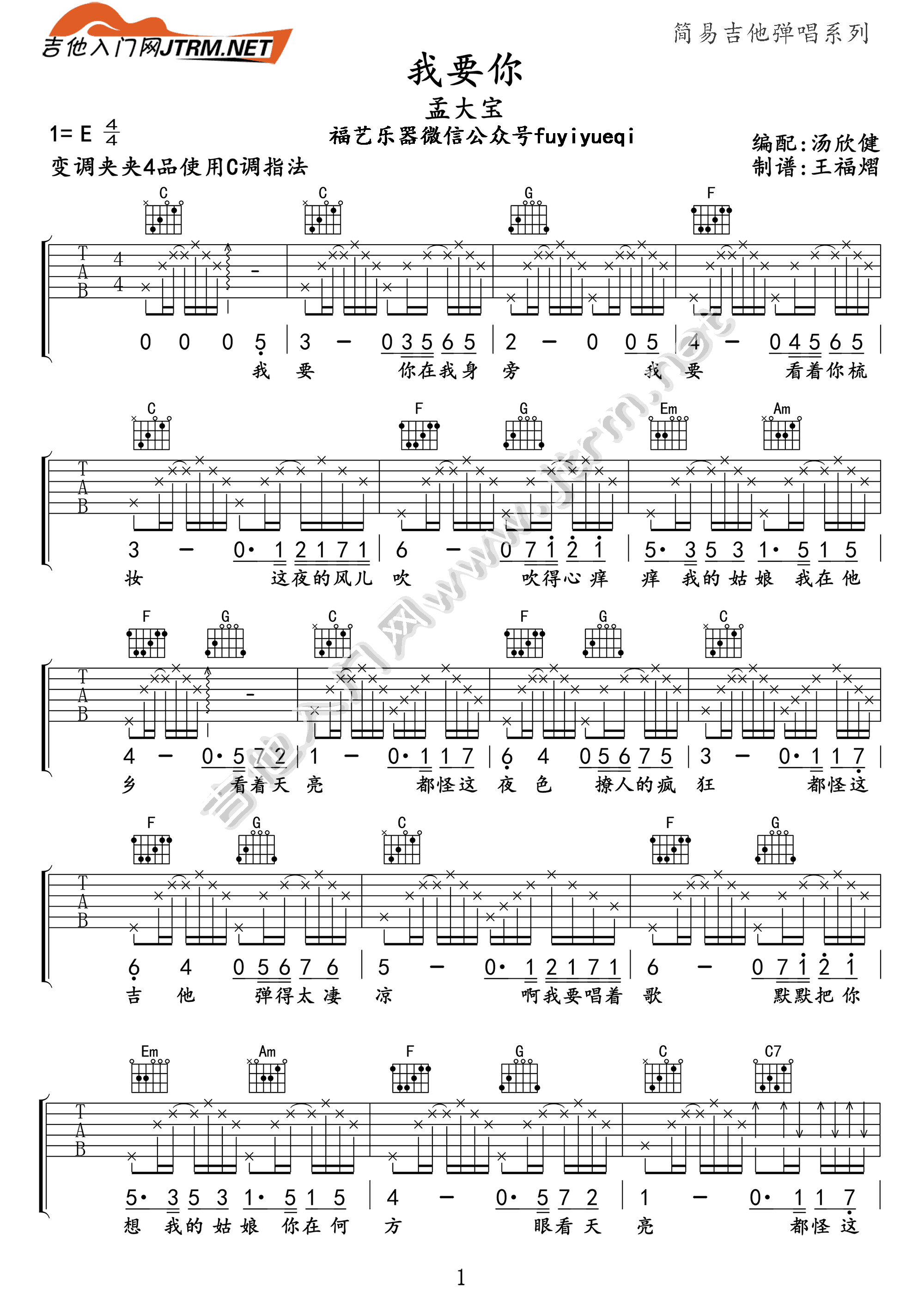 曲谱介绍: 附教程《我要你》吉他弹唱谱,采用C调指法编配,共有2张高清图谱,免翻页排版设计。