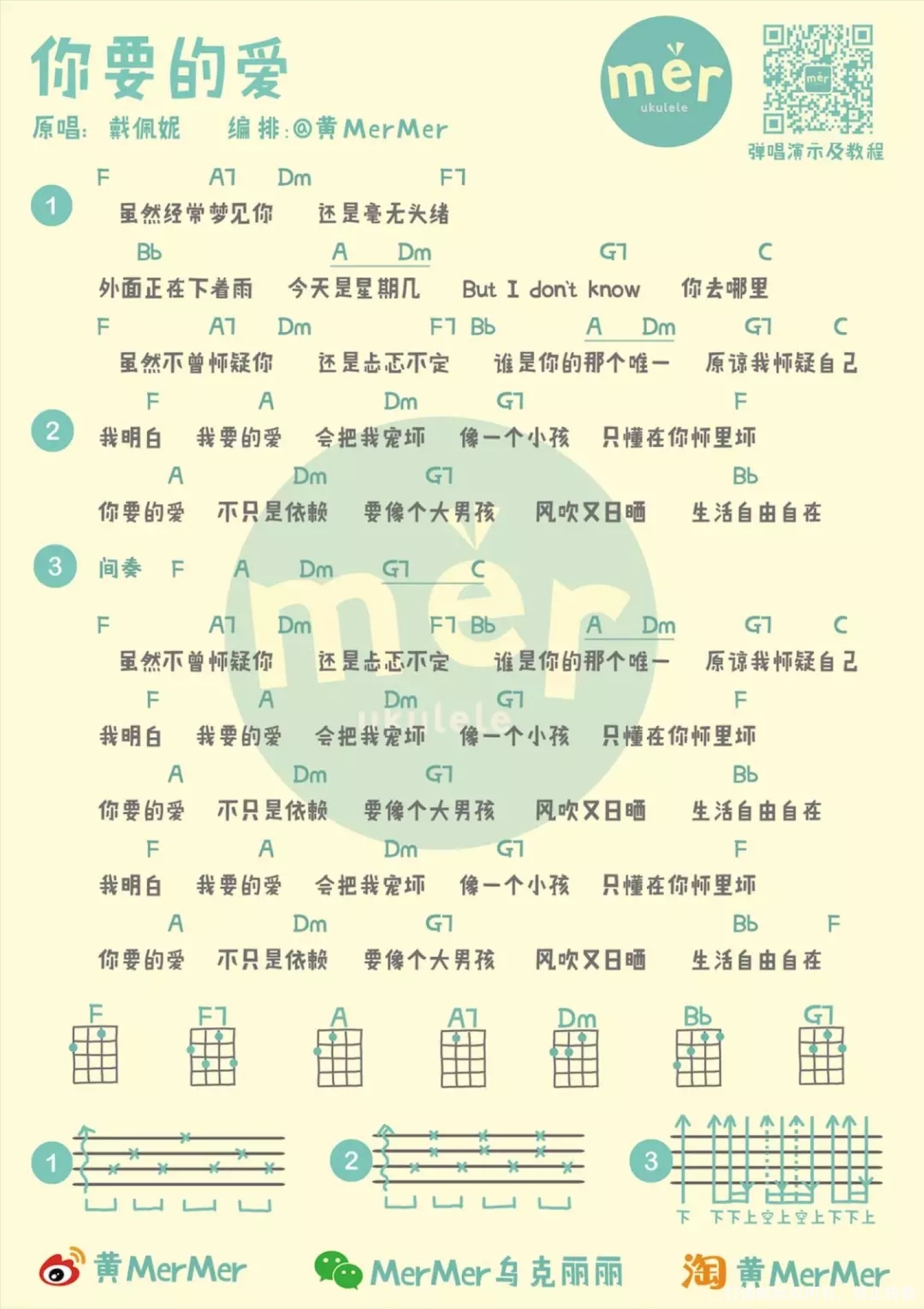 曲谱介绍: 《你要的爱》应该是属于我们90后老阿姨的集体回忆了(哭)。第一个F和弦一响起,脑子里就能全是大S版《流星花园》的画面。 “2002年3月8日,国家广电总局有关部门要求立即暂停《流星花园》。停播的原因是:该剧在社会上产生了很大的负面影响,易误导青少年。” 消息灵通的我妈,当然不会错过这种消息,于是我被点名禁止观看《流星花园》。其实我本来真的没想看,一被禁,阿mer的好奇心就来了!偷偷摸摸地硬是利用课余时间在没有回放功能的老古董电视里艰难地把这部剧追完了!很多狗血的情节已经记不清了,但这首片尾曲真的时隔这么多年还是能免歌词张口就来~   弹唱   教学   曲谱