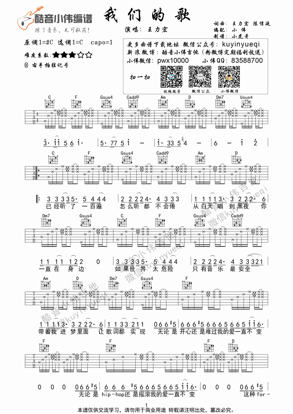 曲谱介绍: 王力宏《我们的歌》吉他弹唱谱,采用C调指法编配,酷音小伟编配出品,共有2张高清图谱,免翻页排版设计。