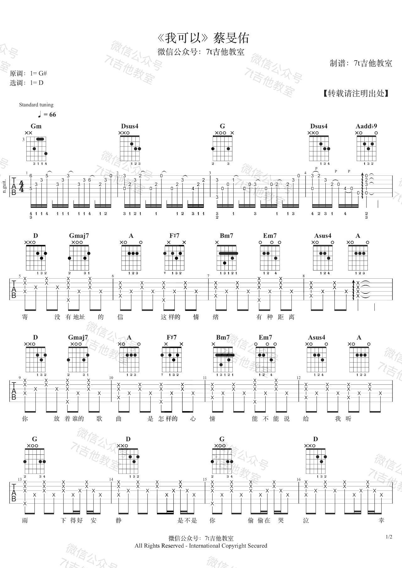 曲谱介绍: 蔡旻佑《我可以》吉他弹唱谱,采用D调指法编配,7T吉他教室编配出品,共有2张高清图谱,免翻页排版设计。