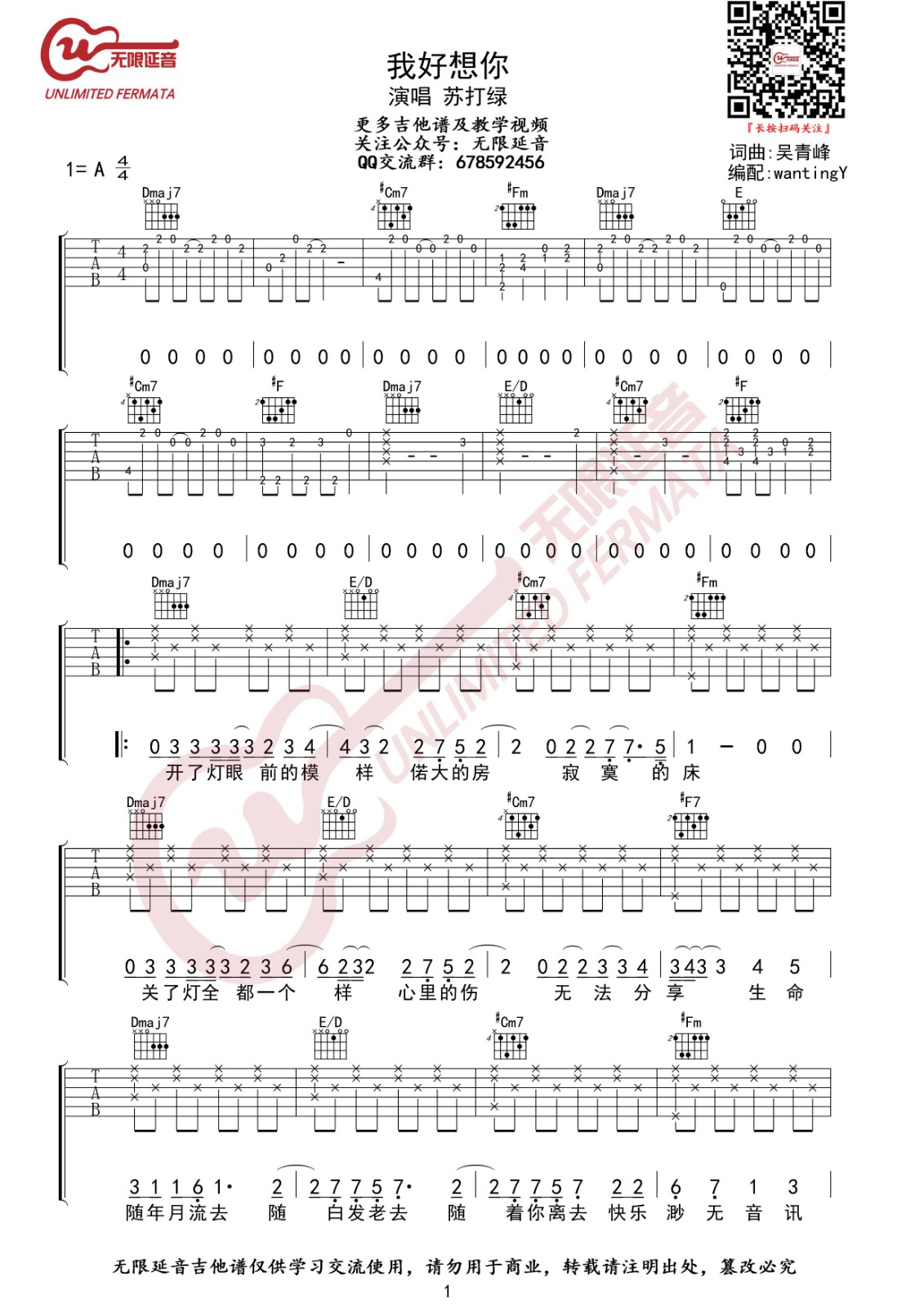 曲谱介绍: 苏打绿《我好想你》吉他弹唱谱,采用A调指法编配,无限延音编配出品,共有3张高清图谱。