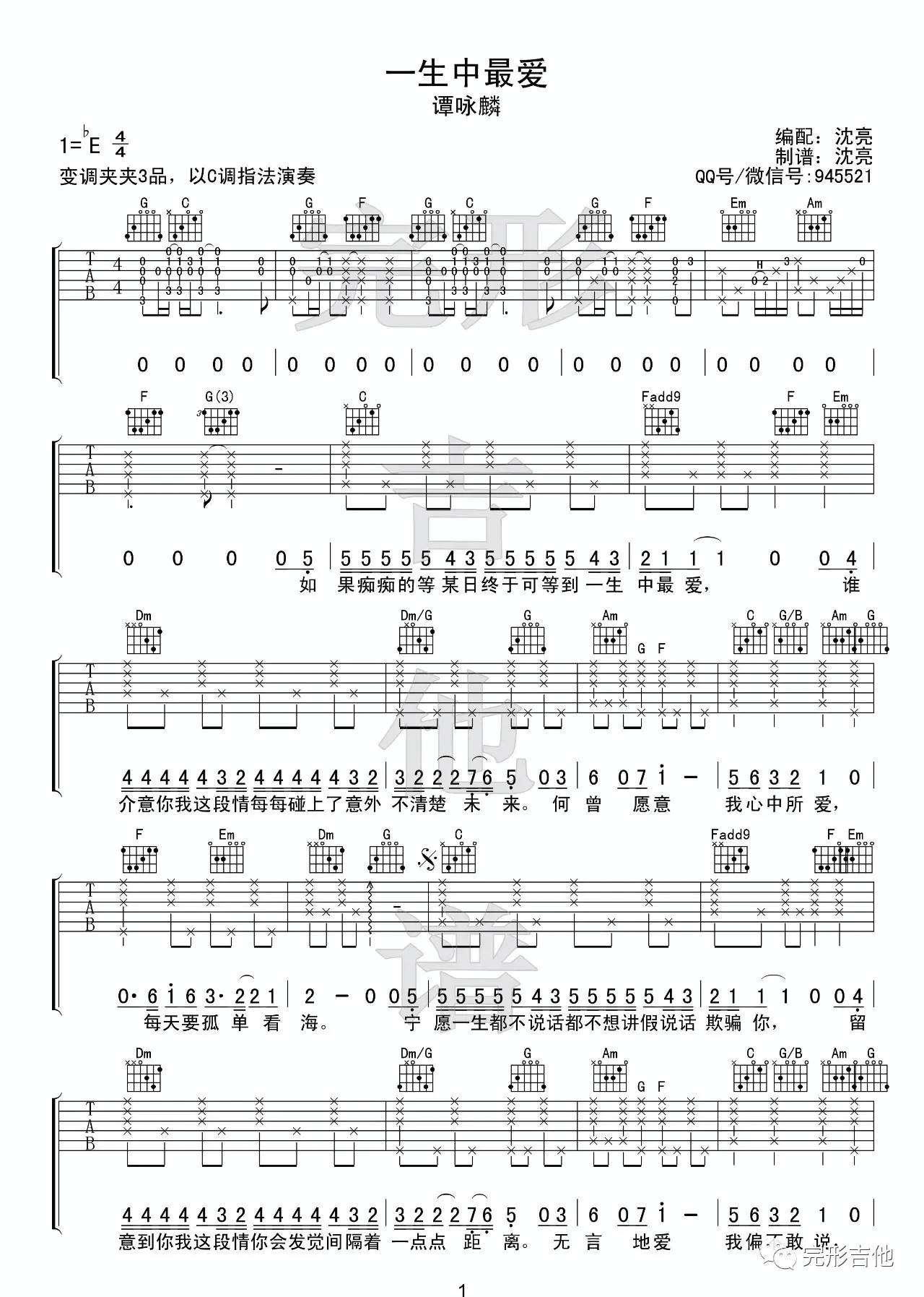 曲谱介绍: 谭咏麟《一生中最爱》吉他弹唱谱,采用C调指法编配,完形吉他编配出品,共有3张高清图谱。