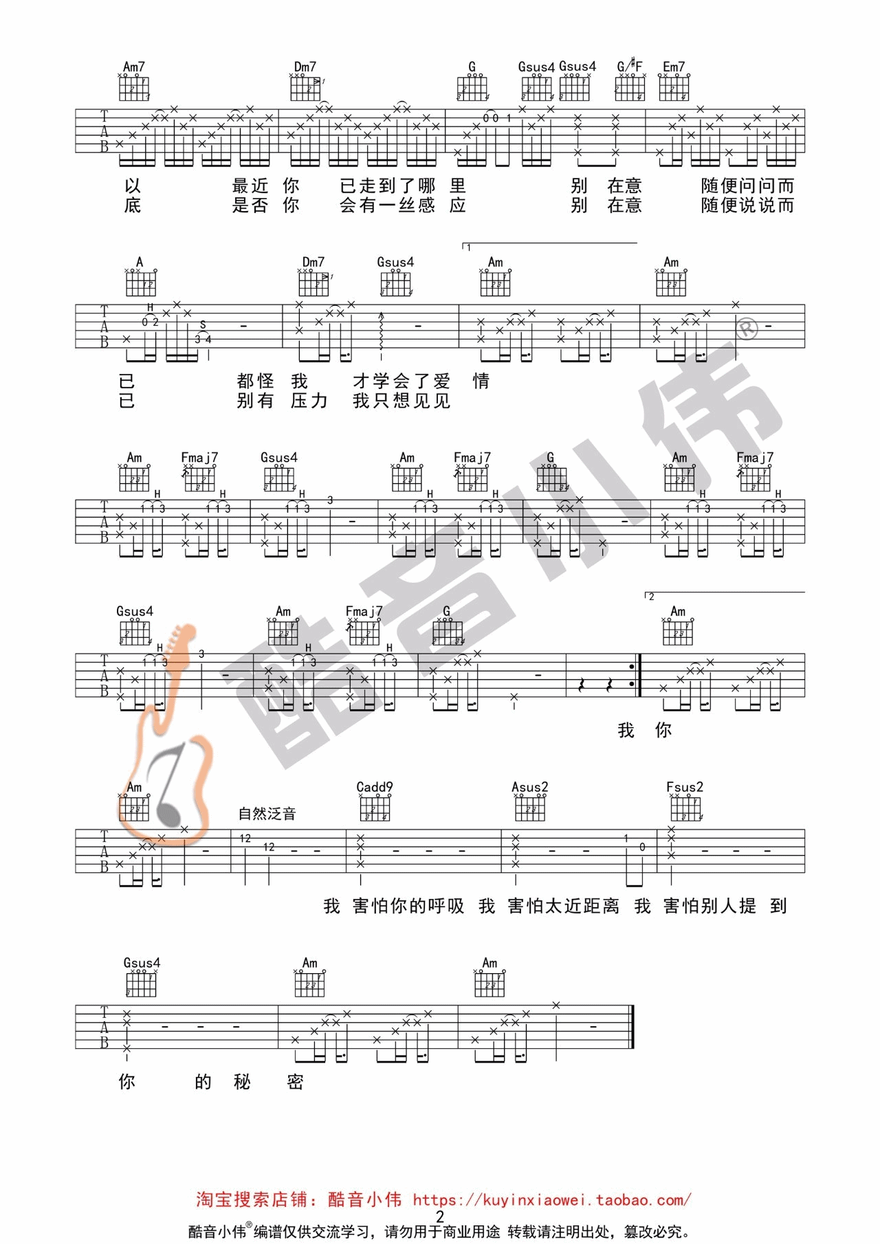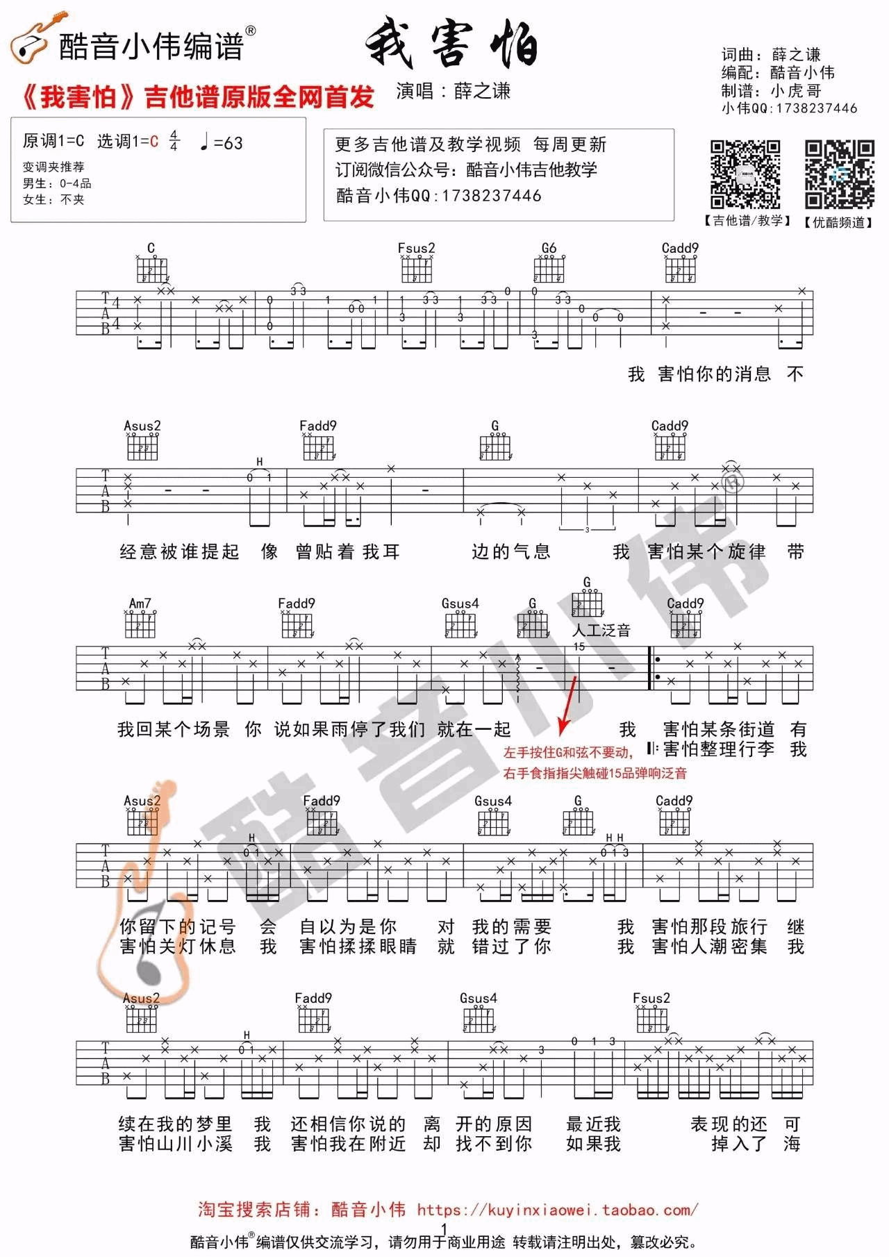 曲谱介绍: 薛之谦《我害怕》吉他弹唱谱,采用C调指法编配,酷音小伟编配出品,共有2张高清图谱,免翻页排版设计。